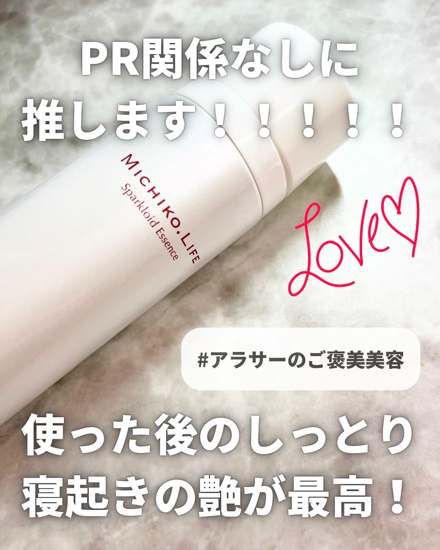 MICHIKO.LIFE スパークロイドエッセンスは、炭酸ガスを溶け込ませた美容液で、ミクロサイズの炭酸濃密泡が、ピタッと肌に密着し、世界で1つのオリジナル浸透型美容液成分「MICHIKOLOID」や天然由来の希少オイルを肌のすみずみまで届け、キレイに。 ミクロサイズの炭酸泡が、ピタッと肌に密着し、美容液成分や天然由来の希少オイル成分が角質層のすみずみまで届く。 まるで生クリームみたいにツヤツヤころんとした泡状の美容液が肌にのせると、すっと馴染むの。