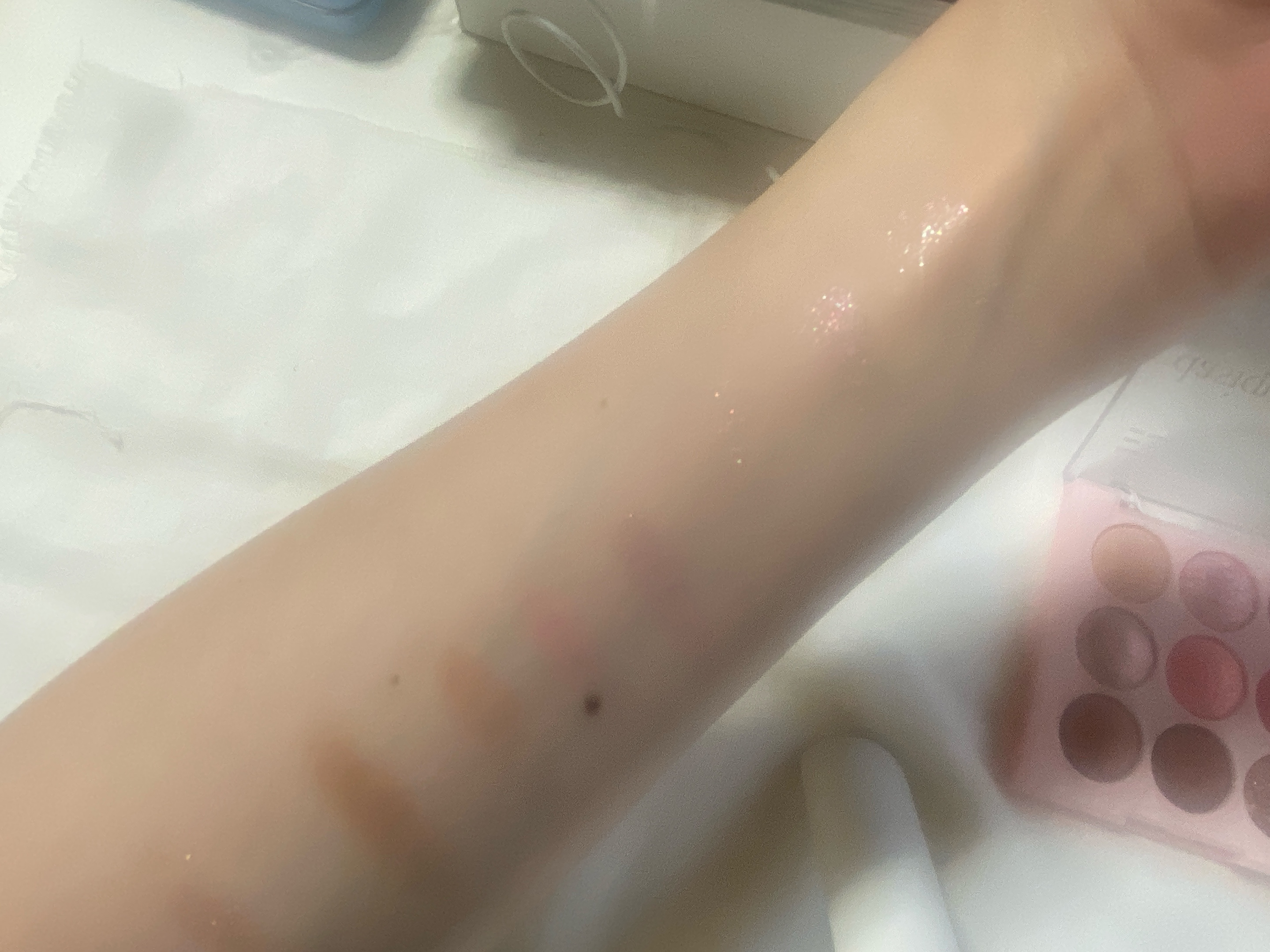 滑らかなミルクティーに淡いバラの花びらをほのかに淹れた ソフトロージーブラウンパレット☕️ˊ˗ くすみローズブラウンが最高で マット7色・シマー1色・グリッター1色のテクスチャーで使いやすい9色.ᐟ.ᐟ しっとりした粉質で粉飛びしにくく 淡いけどしっかり発色してくれるのが◎