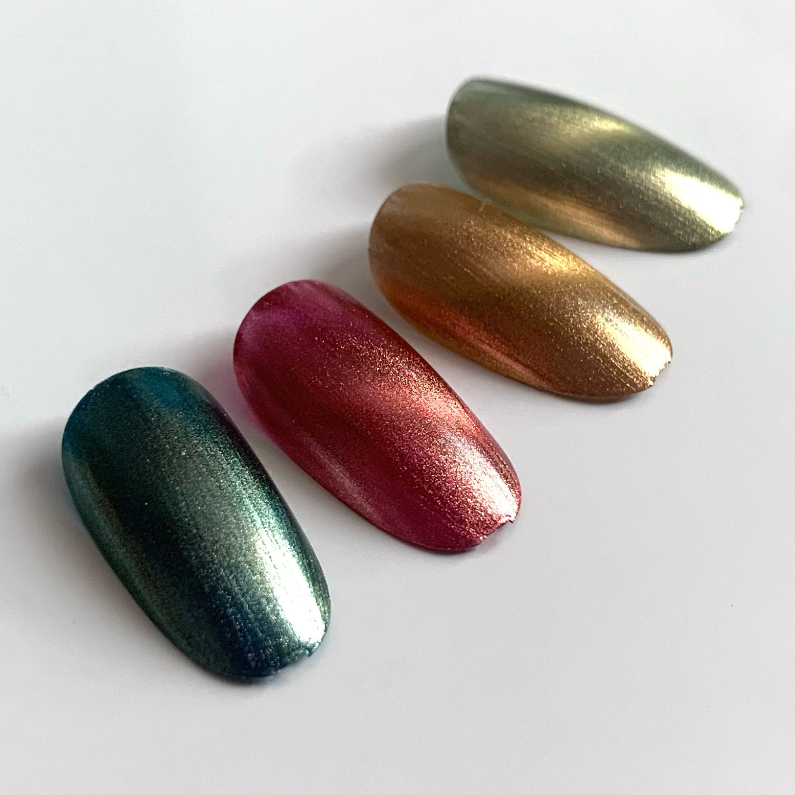 Cosmic Tear きらめく銀河のように神秘的なゴールデンブルー make me blush パッと頬を染めるように愛らしいピンクレッド TIGER EYE 天然石のような輝きのブロンズブラウン EXOTIC 吸い寄せられるほどミステリアスなピスタチオゴールド