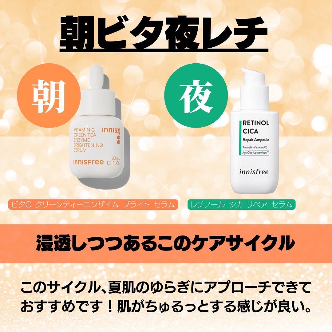 レチノールシカリペアセラムビタCグリーンティーエンザイムブライトセラム朝ビタ、夜レチってよく聞くけど実際どれ使ったらいいのか、朝と夜は別ブランドでいいの?とか悩みは尽きなかったんだけど、これはビタミンも、レオノールも両方あるからライン使いで使...