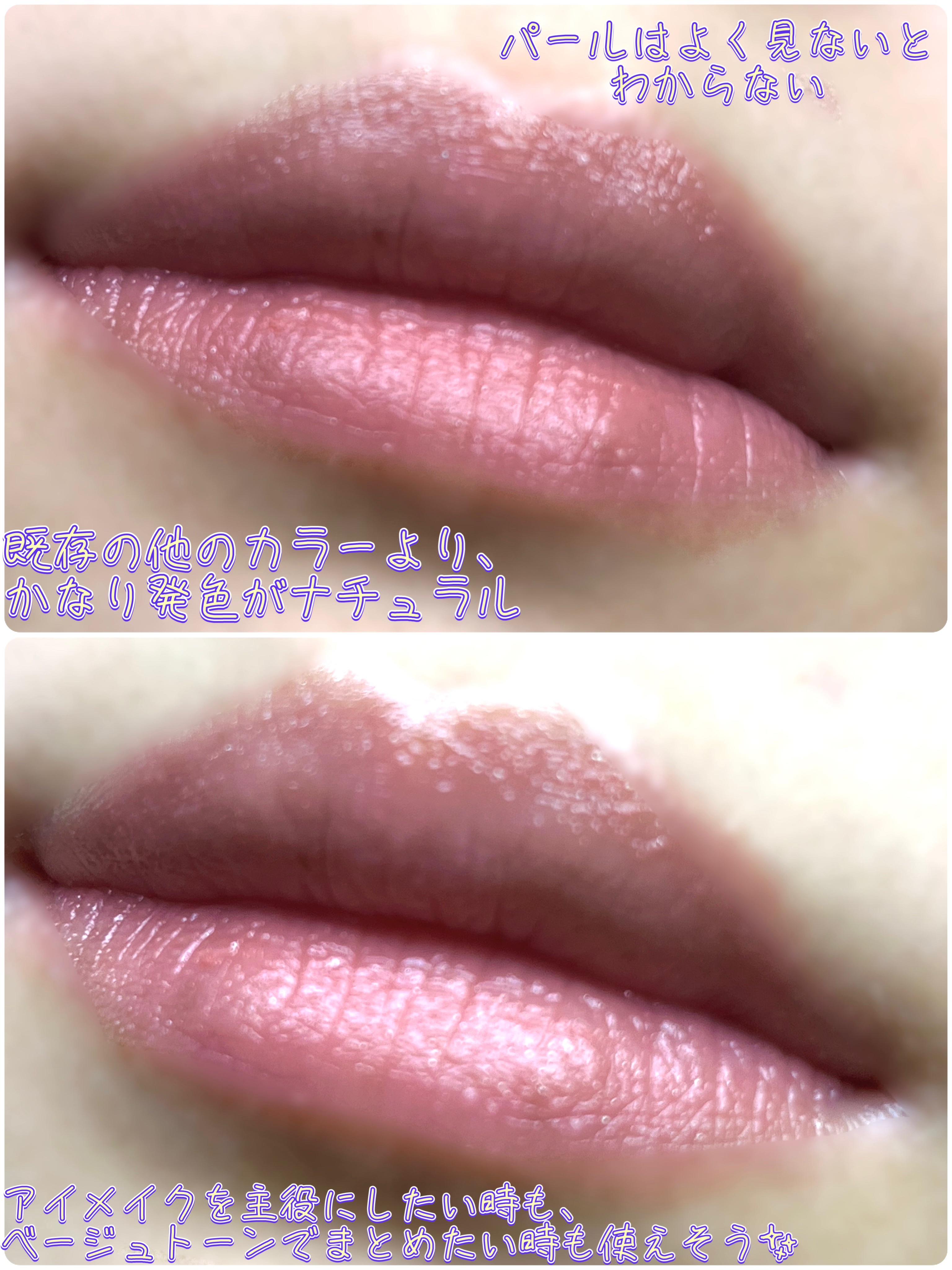 中身のラメ量はないか、とても少しでした! スウォッチのときはベビーピンクでしたが、私の唇ではビビットピンクでした。 塗ってから、無色→ベビーピンク→ビビットピンクと時間経過で色が濃くなっていく&青みになっていく印象です🌸 薄く塗るのが⭕️なようです! 保湿感はあるし、落ちにくいのでこの色が似合う方にはおすすめですが、スウォッチで気付きにくい部分ですので注意が必要かもしれません…! 一番最初のスウォッチと、二度目以降のスウォッチでも色が少し違く見えたのでもしかしたら、吹き付けの部分がなくなればスウォッチでもそのものの色味がみれるかもしれません! 店頭のスウォッチで吹き付けが取れていなかったら何度か手にスウォッチしてみてもいいかもしれません…!