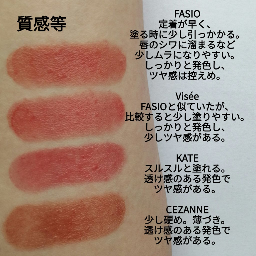 FASIO:定着が早いため、塗る時に少し引っかかる感じがあり、唇のシワに溜まるなど少しムラになりやすかった。しっかりと発色し、ツヤ感は控えめ。 Visée:FASIOと似ていたが、比較すると少し塗りやすかった。しっかりと発色し、少しツヤ感がある。 KATE:スルスルと塗れる。透け感のある発色でツヤ感がある。 CEZANNE:少し硬め。薄づきで、透け感のある発色でツヤ感がある。 FASIO:擦れにはある程度強かったが、油には弱く、ほとんど残らなかった。 Visée:FASIOとほとんど同じだった。 KATE:擦れ、水、油の全てに強かった。 CEZANNE:薄づきなため、擦れには弱かったが、水と油では薄く残っていた。