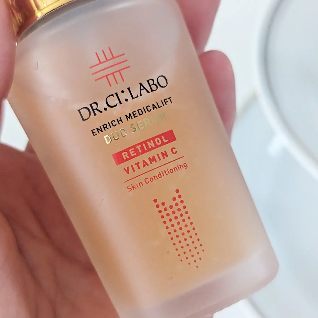 2層式になっていて2秒間シェイクして使う新感覚美容液です🧴 純粋レチノール*1(ハリ・弾力)×高浸透ビタミンC(APPS)*2(うるおい・毛穴・キメ・くすみ) 肌表面がうるおって毛穴が目立ちにくくなるところと、キメが整って肌の内側*3からのハリを実感できるところが大好きです🤍