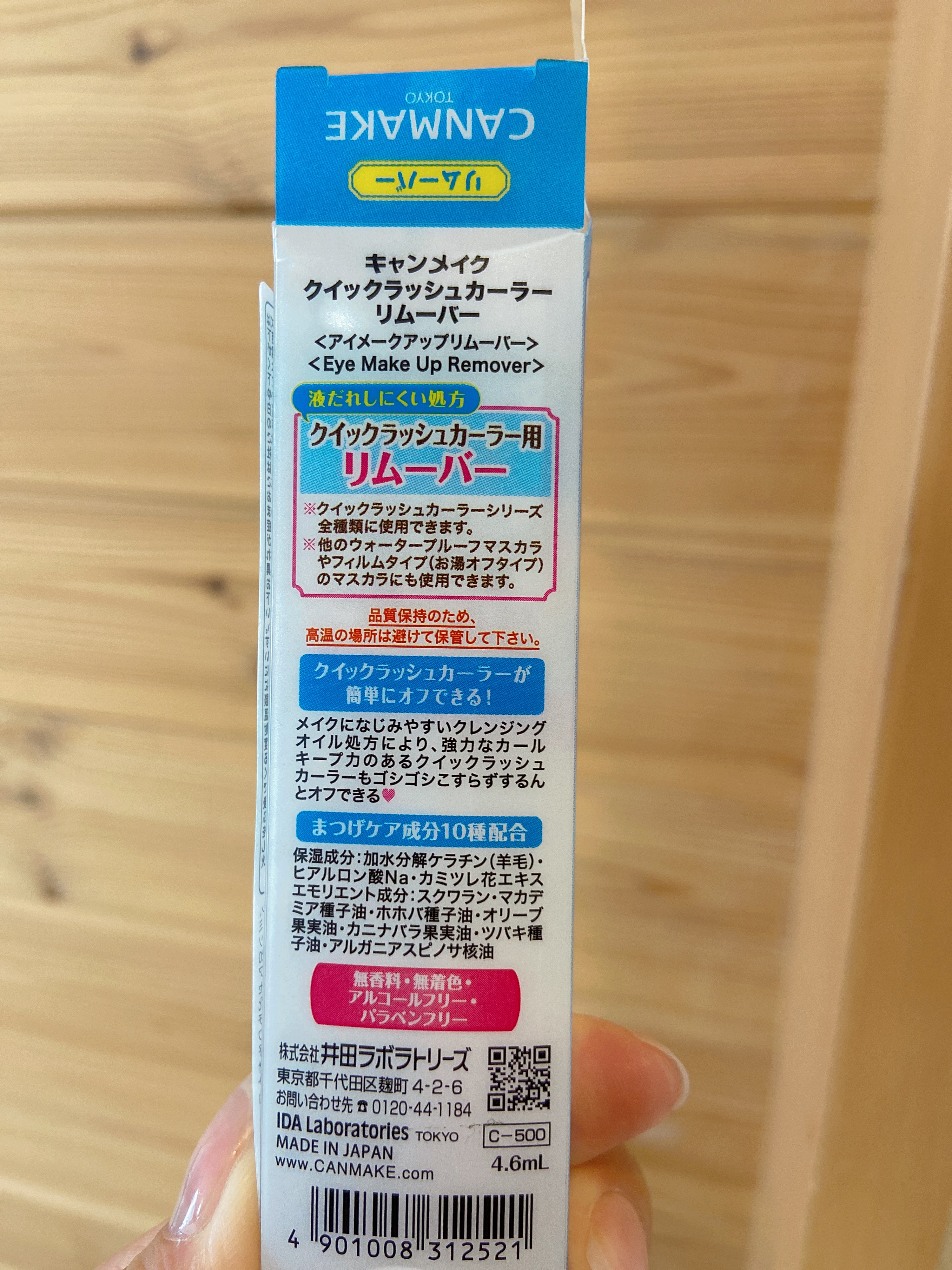 - <クイックラッシュカーラーリムーバー> 水、BG、ヒアルロン酸Na、フェノキシエタノール、スクワラン、トコフェロール、ホホバ種子油、オリーブ果実油、カニナバラ果実油、ミネラルオイル、カミツレ花エキス、ツバキ種子油、マカデミア種子油、水添ポリイソブテン、アルガニアスピノサ核油、トリイソステアリン酸PEG-20グリセリル、オクチルドデカノール、イソステアリン酸PEG-20グリセリル、ジメチルシリル化シリカ、(C13-15)アルカン、加水分解ケラチン(羊毛)