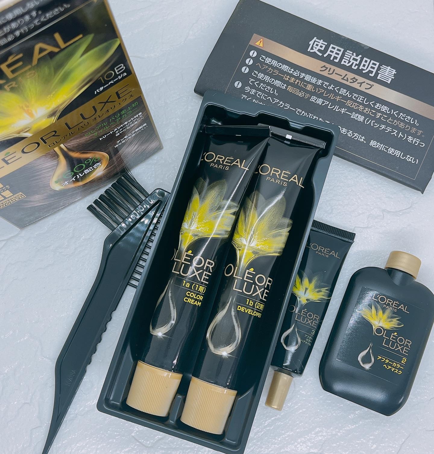 - <10B バターベージュ> (ロレアル パリ オイルインヘアカラー 1剤 10B 医薬部外品)パラアミノフェノール※、メタアミノフェノール※、5-(2-ヒドロキシエチルアミノ)-2-メチルフェノール※、パラアミノオルトクレゾール※、トルエン-2,5-ジアミン※、レゾルシン※、精製水、流動パラフィン、パルミチン酸セチル、ベヘニルアルコール、濃グリセリン、ポリオキシエチレンオレイルエーテル、ポリオキシエチレンアルキル(10~14)エーテル(5E.O.)、ポリオキシエチレンセトステアリルヒドロキシミリスチレンエーテル、カルボキシビニルポリマー、ピロ亜硫酸ナトリウム、エデト酸、アスコルビン酸、モノエタノールアミン (ロレアル パリ オイルインヘアカラー 2剤 医薬部外品)過酸化水素水※、精製水、サリチル酸ナトリウム、ヒドロキシエタンジホスホン酸四ナトリウム液、ピロリン酸ナトリウム、セトステアリルアルコール、流動パラフィン、濃グリセリン、ポリオキシエチレンステアリルエーテル、ポリオキシエチレンベヘニルエーテル、塩化N,N,N’,N’-テトラメチル-N-ヘキサメチレン-トリメチレン-ジアンモニウム共重合体液、ポリ塩化ジメチルジメチレンピロリジニウム液、ポリオキシエチレンセトステアリルヒドロキシミリスチレンエーテル、リン酸、dl-α-トコフェロール (ロレアル パリ アフターカラーヘアマスク)水、セテアリルアルコール、ベヘントリモニウムクロリド、グリセリン、アモジメチコン、セチルエステルズ、イソプロパノール、フェノキシエタノール、PCA-Na、トリデセス-6、グルコン酸クロルヘキシジン、リナロール、セトリモニウムクロリド、ヘキシルシンナマル、オレアミドオクタデカンジオール、クマリン、リモネン、ラベンダー油、オレンジ果皮油、香料 (ロレアル パリ アフターカラーヘアオイル):イソドデカン、トリ(カプリル酸/カプリン酸)グリセリル、ジ メチコン、ジカプリリルエーテル、ジメチコノール、トリメチルシロキシケイ酸、スクワラン、ヒマワリ種子油、ヤシ油、(カプリル酸/カプリン酸)グリセリズ、リモネン、トコフェロール、カミツレ花エキス、ビサボロール、ヒポファエラムノイデス種子油、サリチル酸エチルヘキシル、ガーデニアタイテンシス花、イソオイゲノール、ファルネ ソール、シトラール、カニナバラ花エキス、ハス花エキス、アマ花エキス、香料 ※は「有効成分」 ※印のないものは「その他の成分」 <10NG カモミールマット> (ロレアル パリ オイルインヘアカラー 1剤 10NG 医薬部外品)硫酸2,2’-[(4-アミノフェニル)イミノ]ビスエタノール※、トルエン-2,5-ジアミン※、パラアミノフェノール※、塩酸2,4-ジアミノフェノキシエタノール※、メタアミノフェノール※、レゾルシン※、精製水、流動パラフィン、パルミチン酸セチル、ベヘニルアルコール、濃グリセリン、ポリオキシエチレンオレイルエーテル、ポリオキシエチレンアルキル(10~14)エーテル(5E.O.)、ポリオキシエチレンセトステアリルヒドロキシミリスチレンエーテル、カルボキシビニルポリマー、ピロ亜硫酸ナトリウム、エデト酸、アスコルビン酸、モノエタノールアミン (ロレアル パリ オイルインヘアカラー 2剤 医薬部外品)過酸化水素水※、精製水、サリチル酸ナトリウム、ヒドロキシエタンジホスホン酸四ナトリウム液、ピロリン酸ナトリウム、セトステアリルアルコール、流動パラフィン、濃グリセリン、ポリオキシエチレンステアリルエーテル、ポリオキシエチレンベヘニルエーテル、塩化N,N,N’,N’-テトラメチル-N-ヘキサメチレン-トリメチレン-ジアンモニウム共重合体液、ポリ塩化ジメチルジメチレンピロリジニウム液、ポリオキシエチレンセトステアリルヒドロキシミリスチレンエーテル、リン酸、dl-α-トコフェロール (ロレアル パリ アフターカラーヘアマスク)水、セテアリルアルコール、ベヘントリモニウムクロリド、グリセリン、アモジメチコン、セチルエステルズ、イソプロパノール、フェノキシエタノール、PCA-Na、トリデセス-6、グルコン酸クロルヘキシジン、リナロール、セトリモニウムクロリド、ヘキシルシンナマル、オレアミドオクタデカンジオール、クマリン、リモネン、ラベンダー油、オレンジ果皮油、香料 (ロレアル パリ アフターカラーヘアオイル):イソドデカン、トリ(カプリル酸/カプリン酸)グリセリル、ジ メチコン、ジカプリリルエーテル、ジメチコノール、トリメチルシロキシケイ酸、スクワラン、ヒマワリ種子油、ヤシ油、(カプリル酸/カプリン酸)グリセリズ、リモネン、トコフェロール、カミツレ花エキス、ビサボロール、ヒポファエラムノイデス種子油、サリチル酸エチルヘキシル、ガーデニアタイテンシス花、イソオイゲノール、ファルネ ソール、シトラール、カニナバラ花エキス、ハス花エキス、アマ花エキス、香料 ※は「有効成分」 ※印のないものは「その他の成分」 <10P チェリーピンクブラウン> (ロレアル パリ オイルインヘアカラー 1剤 10P 医薬部外品)