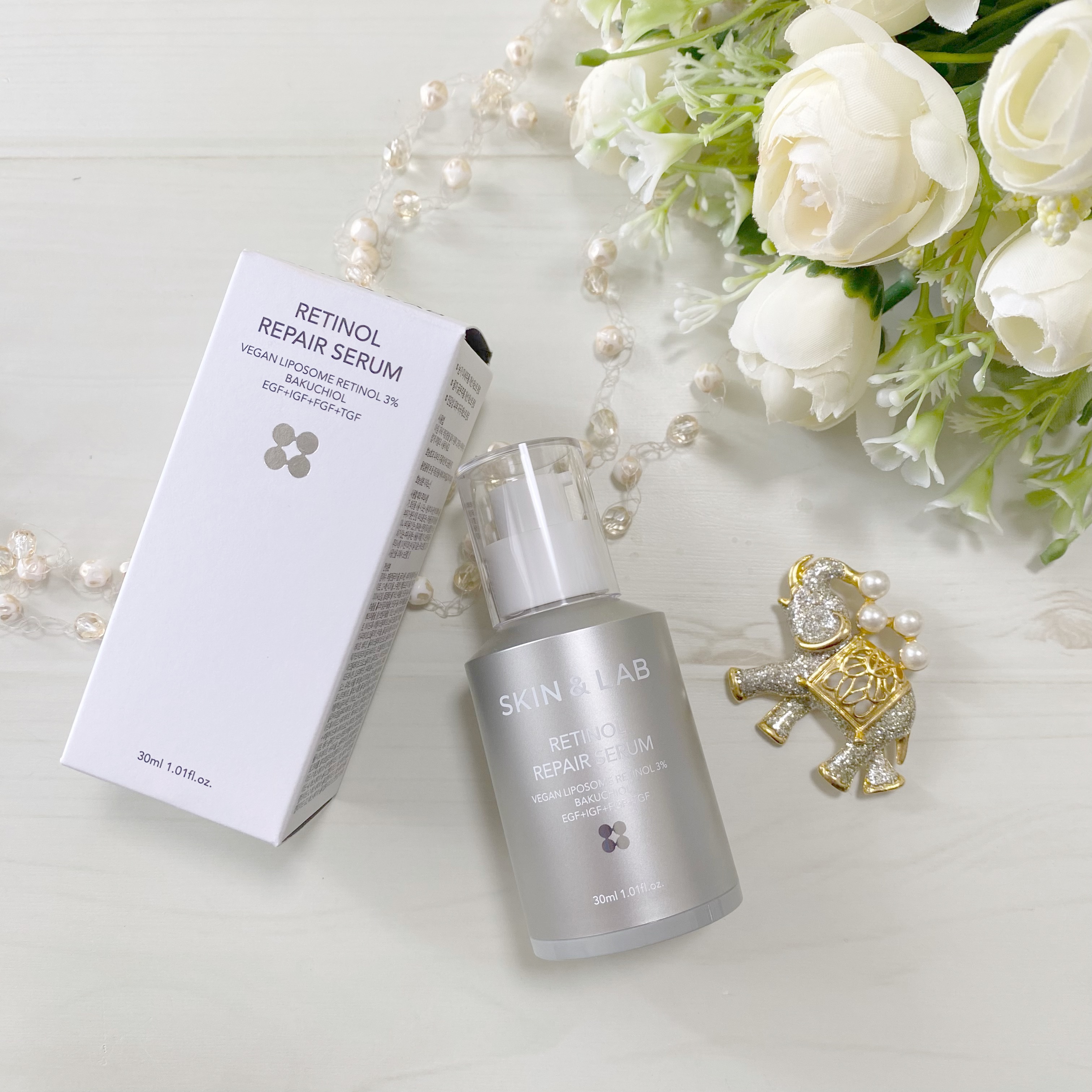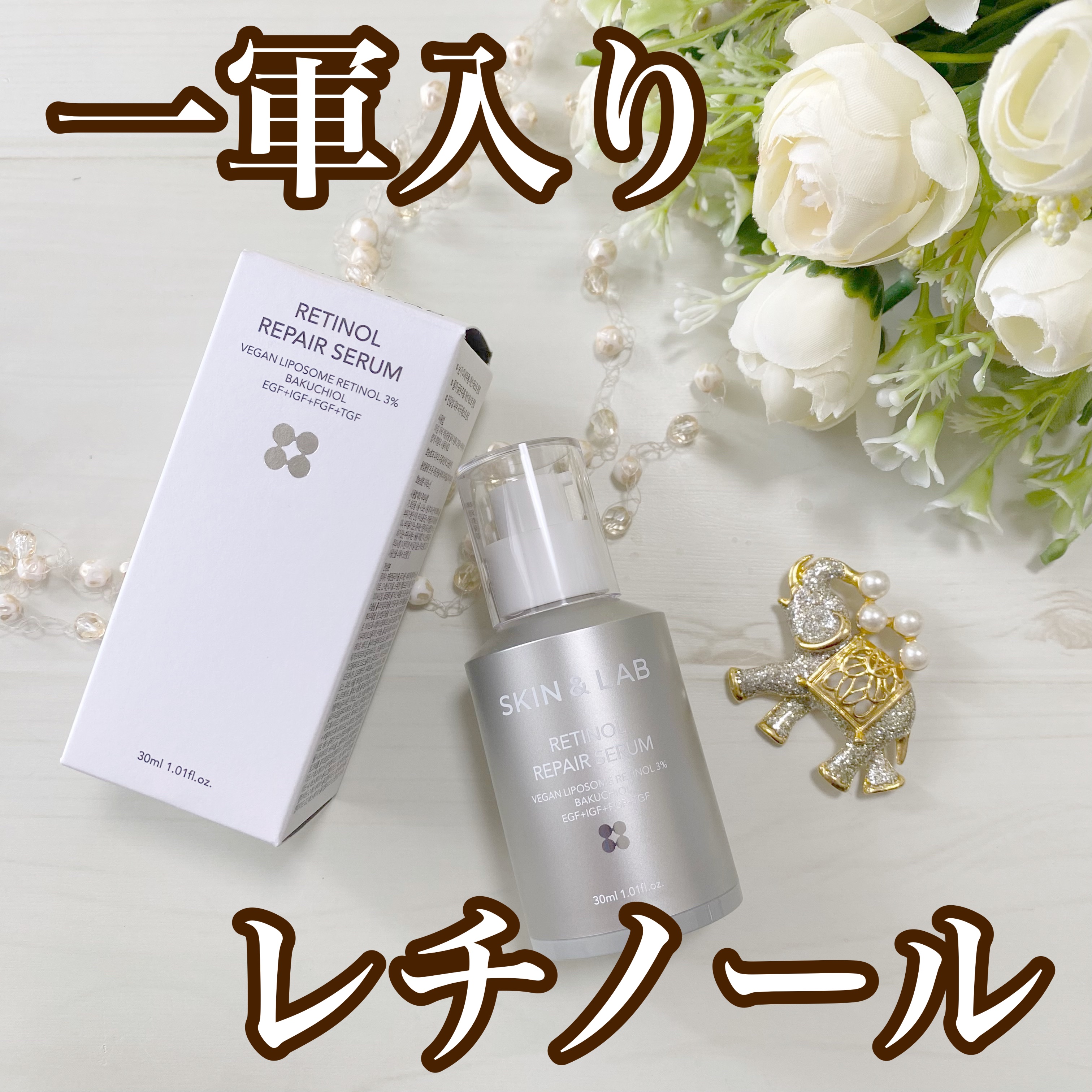 - 刺激を最小限に抑えた使い心地でハリのある肌に導くレチノールセラム ★光と熱に不安定なレチノールを植物性リポソームで安定化させた、SKIN&LABだけのヴィーガンリポソームレチノール*を3%配合。 ★注目の3成分、レチノール*、バクチオール*、ペプチド*配合。 ★年齢を重ねた肌にも潤いやハリを与えるエイジングケアを叶えます。 ★小さいナノリポソームレチノール*で角質層隅々まで浸透し毛穴ケア <成分と効果> ・ヴィーガンリポソームレチノール*:植物性リポソームで安定化させたヴィーガンレチノール*を配合。刺激の少ない使い心地です。 ・バクチオール*:バクチオールは植物由来の成分で肌にハリを与えます。 ・EGF+IGF+FGF+TGF(ペプチド)*:ペプチドは肌本来の力をサポートして、潤いの持続する肌へと導きます。 *整肌成分