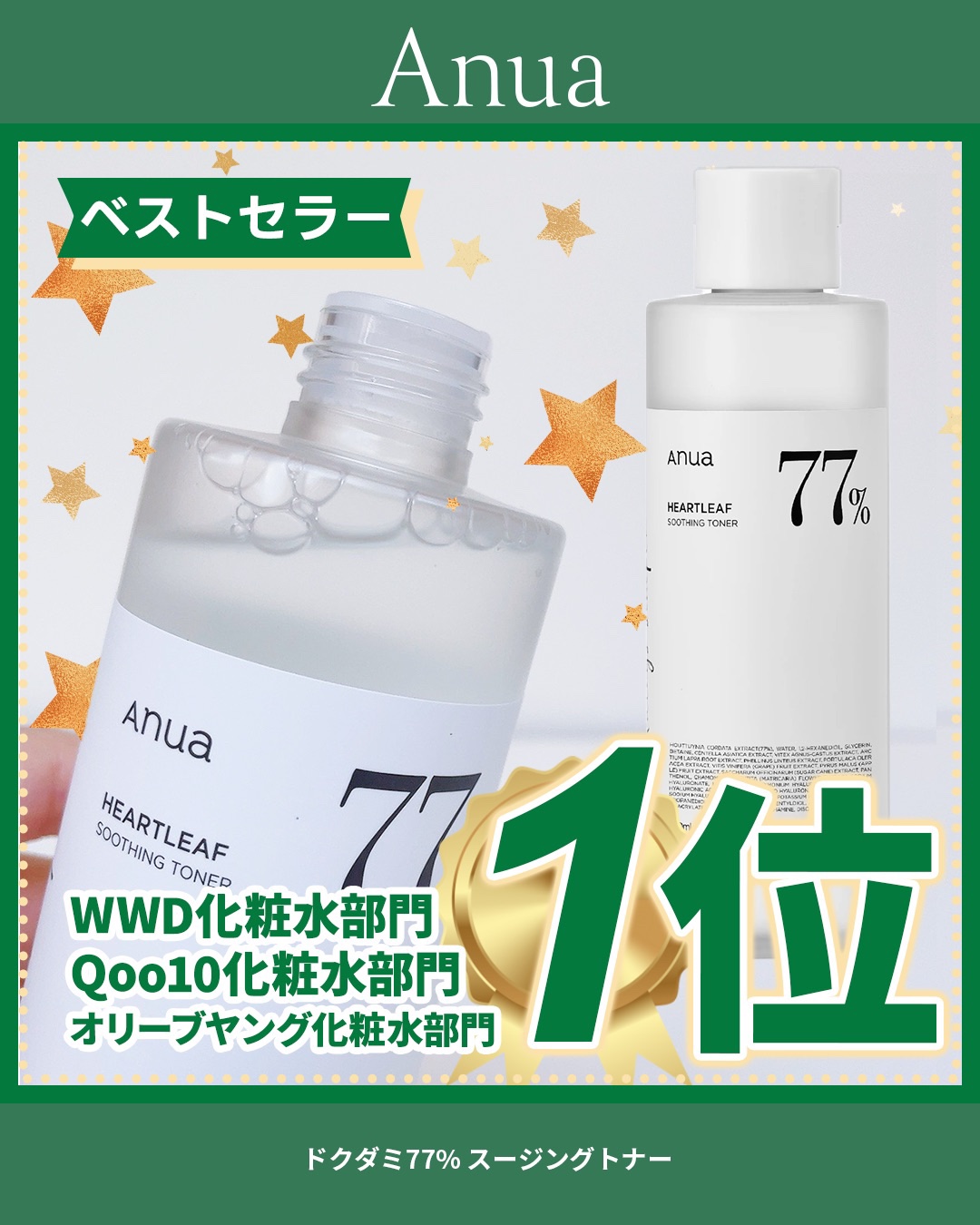 有名すぎる国民トナー テレビCMでも話題になってる🩷 累計販売個数が200万本突破! 77%がドクダミエキス(整肌成分) Anuaが導き出した肌のスージングに適した比率で配合されている! 軽やかなとろみテクスチャーでみずみずしい使用感!肌もひんやり落ち着く感じ!
