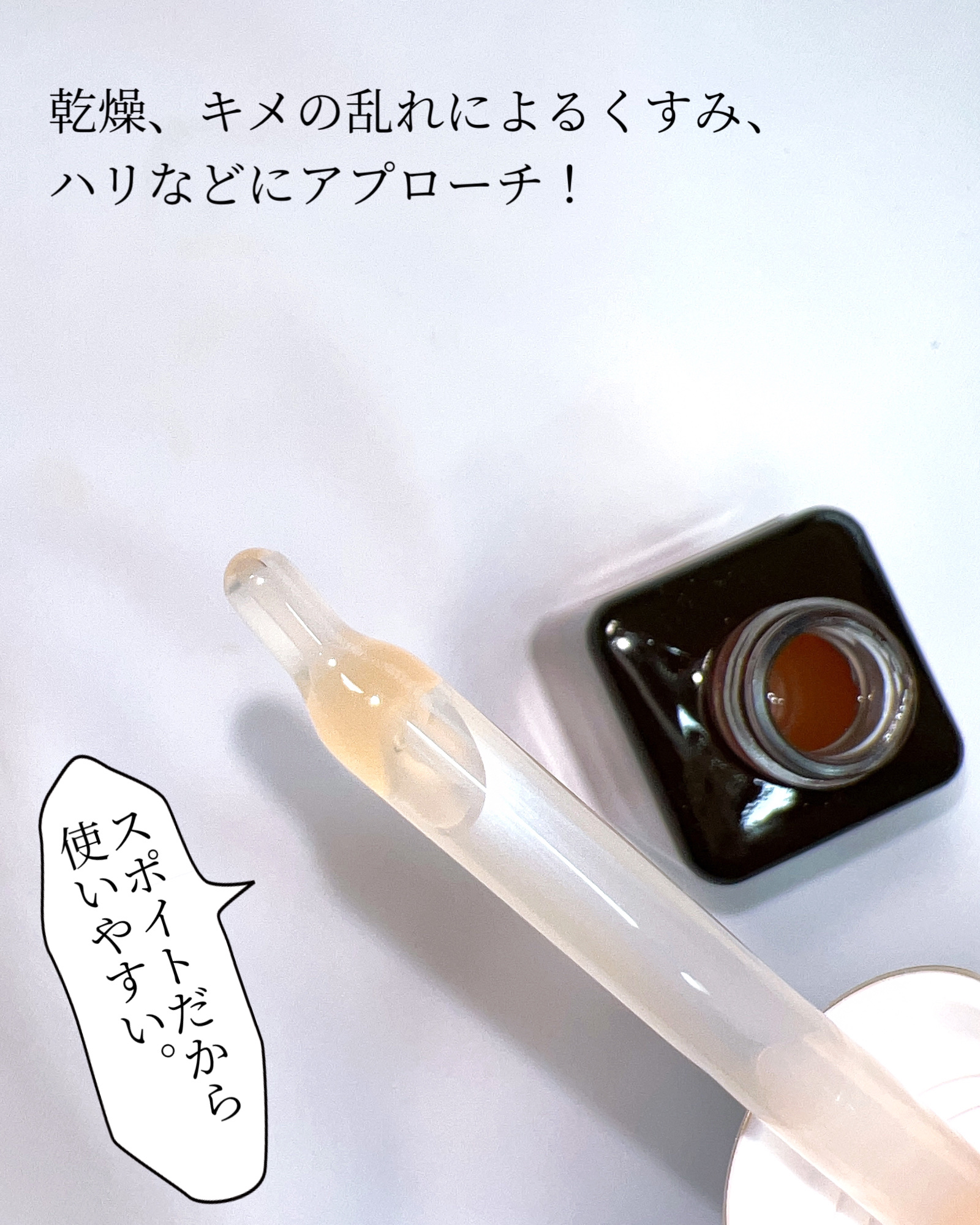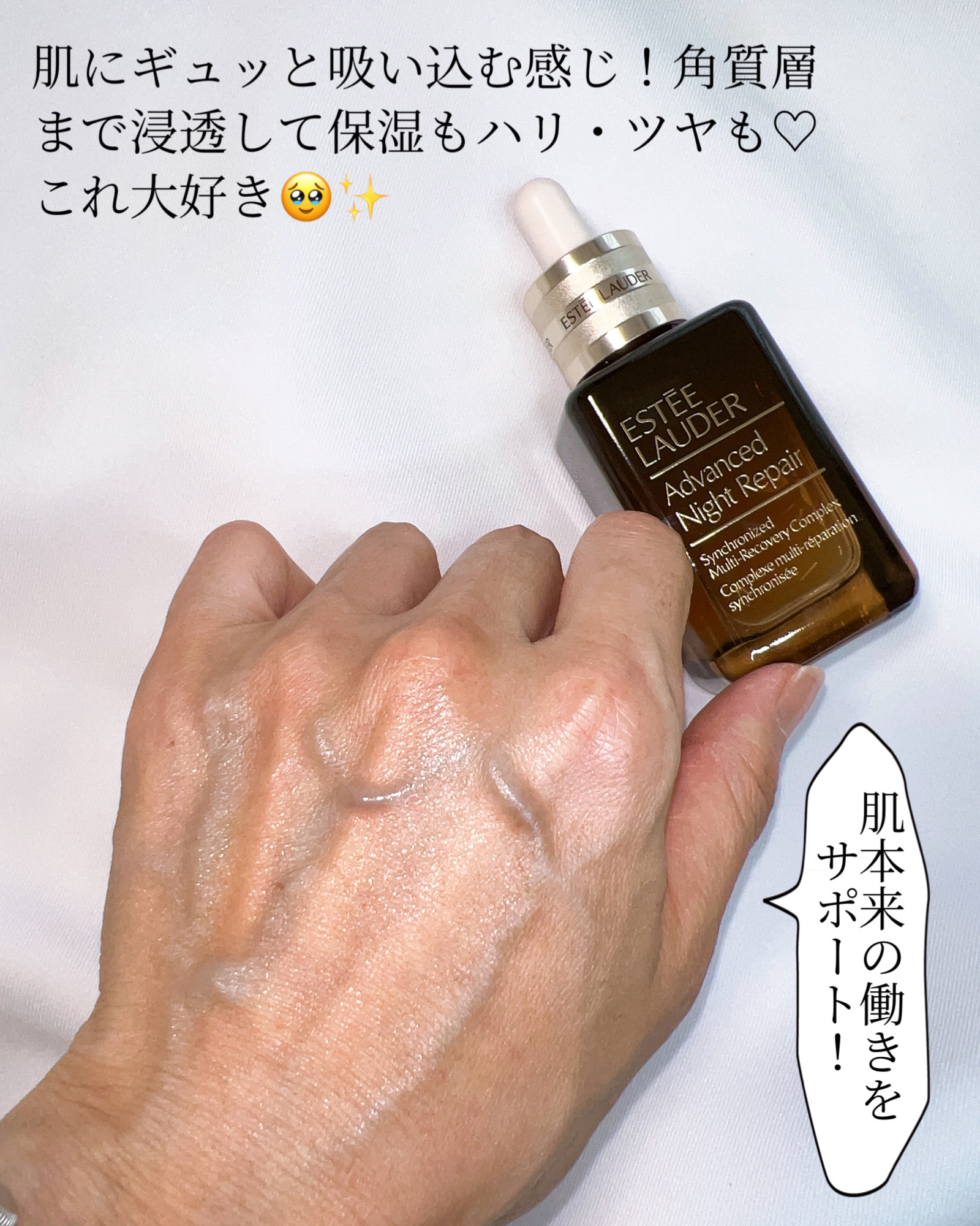 とろっとしたテクスチャー。とろみはあるけど、馴染ませるとサラッとして、ベタつきにくかったです。しっとりして、いつもよりハリがあるように感じました。 昼は乾燥などの外的要因から肌を守り、夜はダメージをケアしてくれるそうです。
