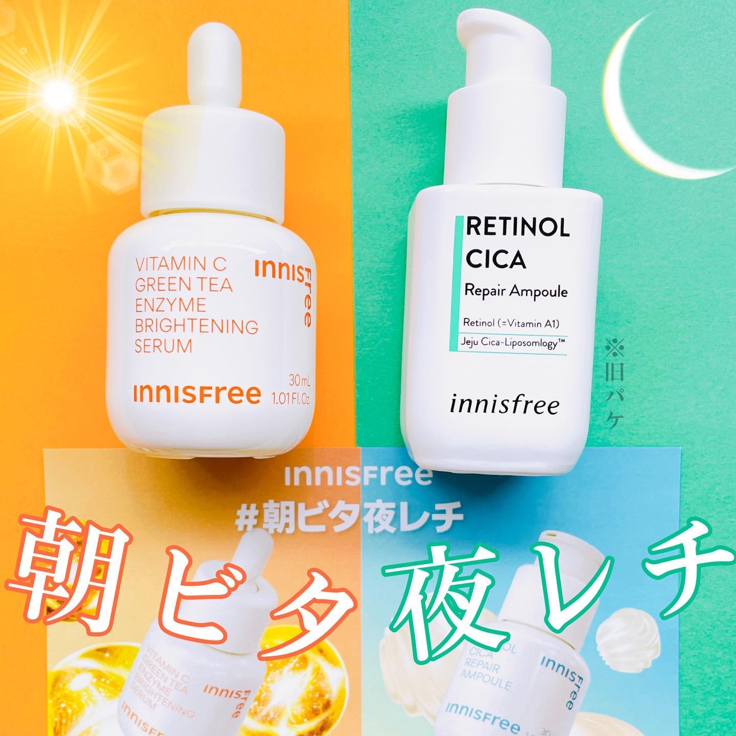 デュアルビタミンC誘導体×グリーンティーエンザイム配合の美容液です。innisfree独自のオイルドロップ処方で、水溶性・油溶性の2種類のビタミンC誘導体の配合を実現👏 やわらかめのジェルのようなテクスチャーで伸びが良く、オレンジ色のカプセルが入っています。肌馴染みも良く、肌に馴染ませた後はベタつきなくもっちりした仕上がりで朝にも使いやすい使用感かと思います! 秋は夏の紫外線などで角質ケアが必要な時期…そんな時にピッタリのビタミンC美容液です!