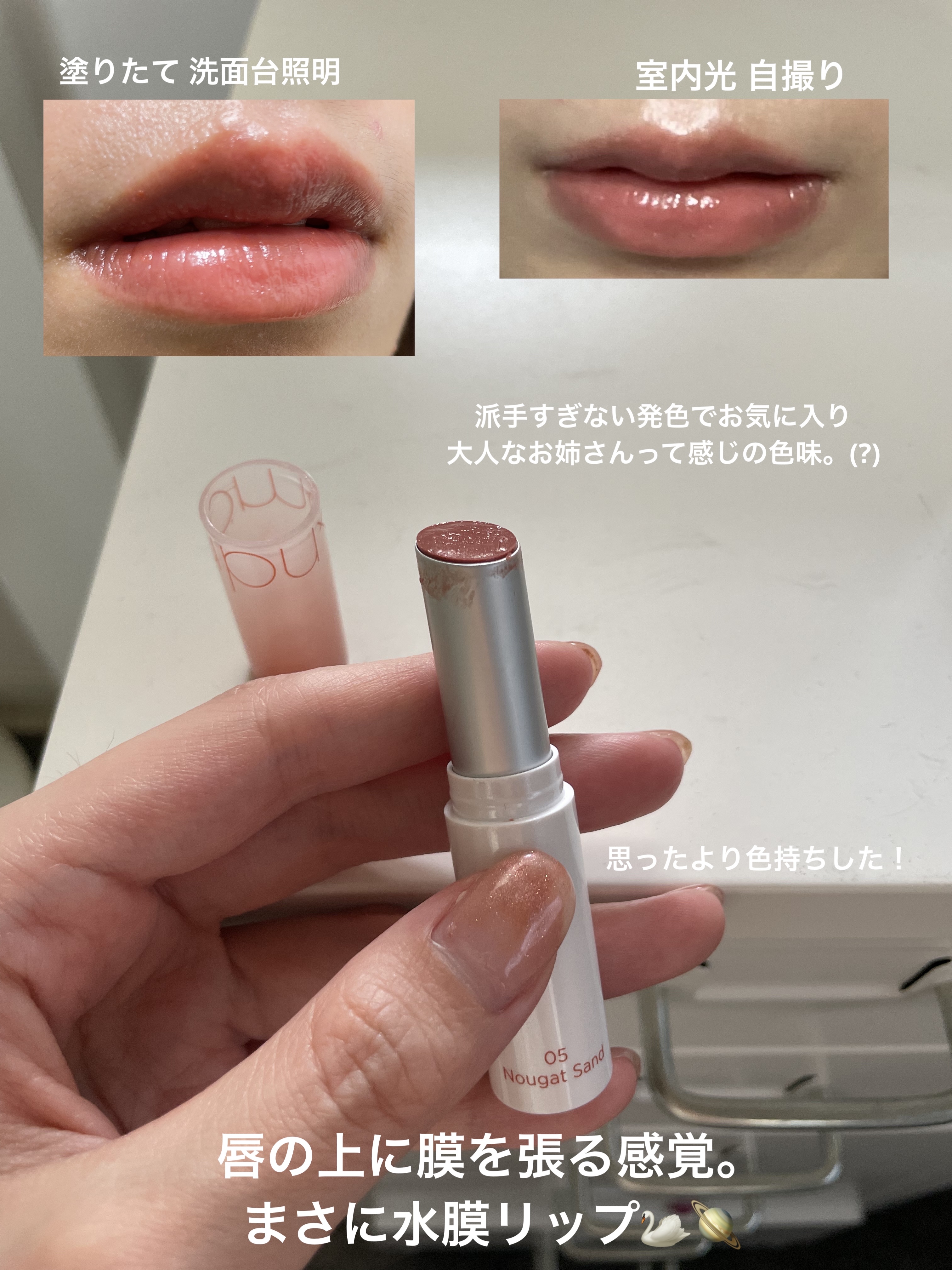 体温で柔らかくなるリップバーム。高音の場所に長時間置かないでほしいとのこと! 05 ヌガーサンドはふわっと溶けるクリームのようなヌガーブラウン 私の肌や唇だとコーラルベージュのような色に発色しました。 色・ツヤ・むりっちり感、どれも派手になりすぎず使いやすかったです🫶 バームだから乾燥しずらくて良かったけど、その分もちはよくないかな?