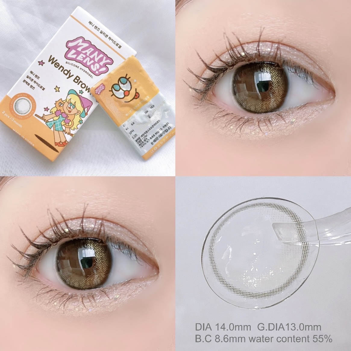 MANYLENS!ꕤWendyBrownキラキラ細かいラメが入ってて綺麗✨三日月🌙の形に自然なラメ!シンプルだけど印象的な瞳に…✨細フチも目をくるっと見せてくれた🤎BC:8.6mmDIA(レンズ直径):14.0mmG.DIA(着色直径):13...
