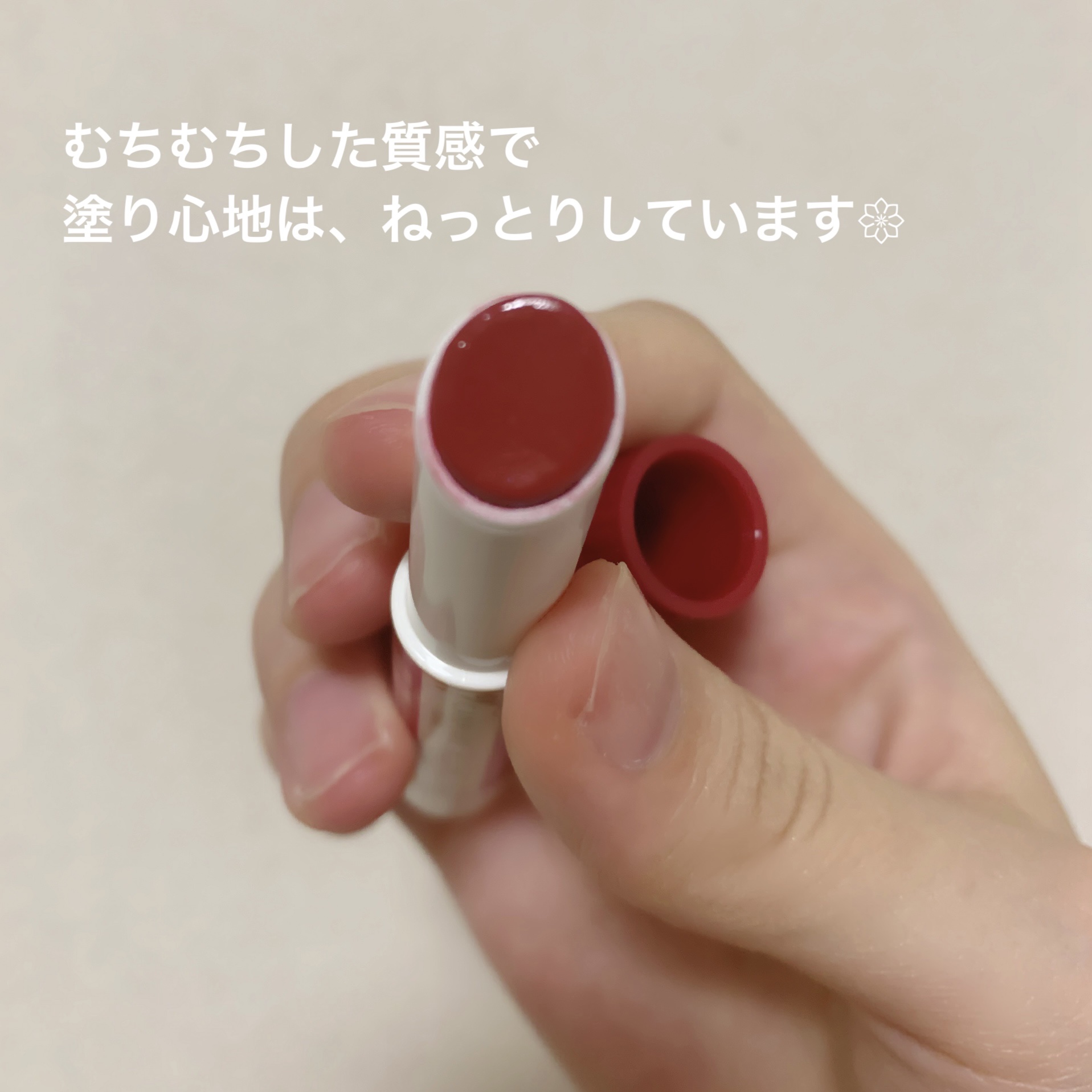 まさに粘膜色っ!といった感じで色味を足すというよりかは、元々の唇の色味を補正するといったニュアンスのあるティントです。 このシリーズの他の色味と比較すると、色持ちはあまり良くないです。 すこし粘度のあるテクスチャです。 甘いフルーツのような匂いがします。