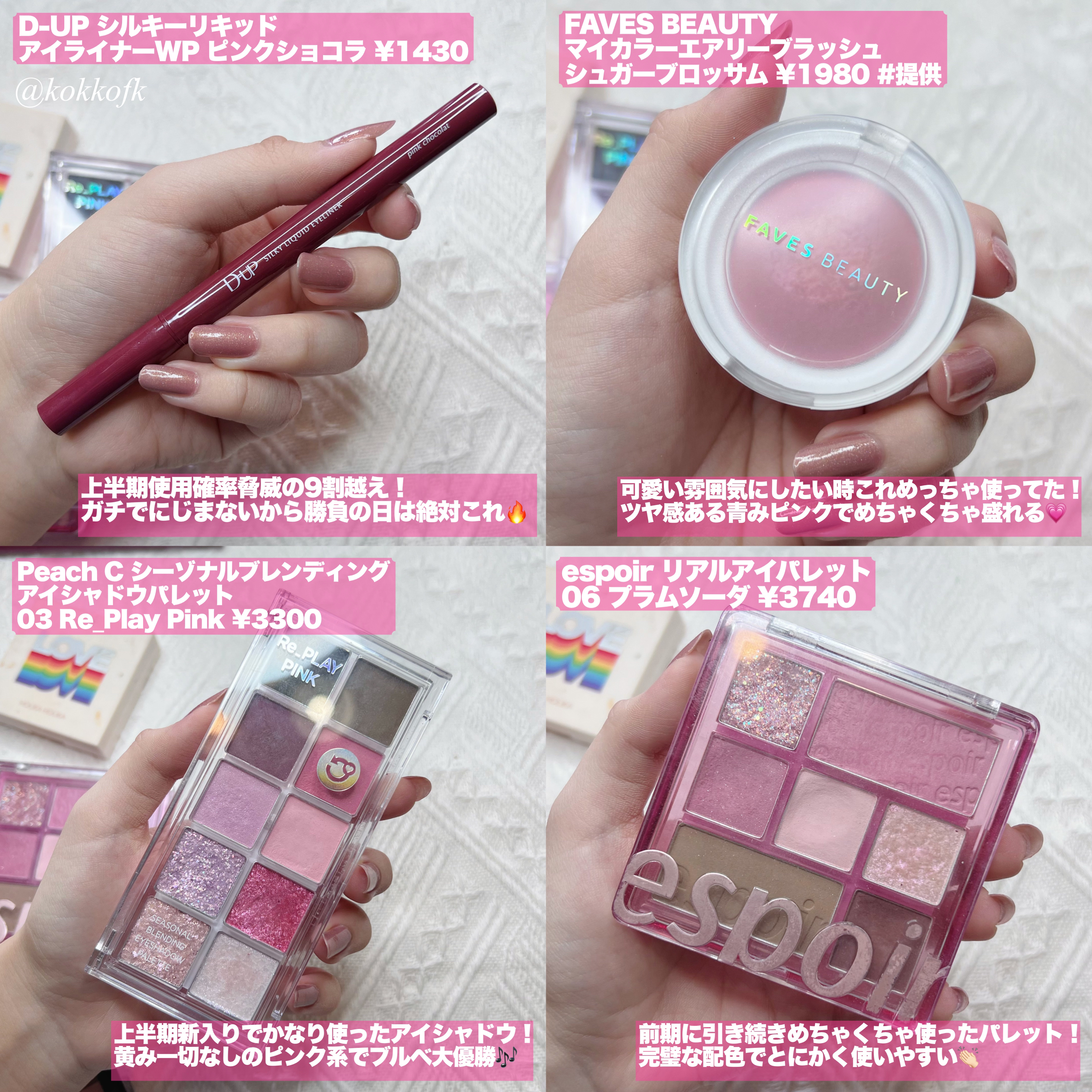 rom&nd────────────ベターザンパレット06 PEONY NUDE GARDEN (¥2900) rom&nd────────────ベターザンアイズ W03 Dry Strawberry (¥1569) HOLIKA HOLIKA────────────マイフェブムードアイパレットMOONY (¥2050) HOLIKA HOLIKA────────────マイフェブムードアイパレットPINK OLOGY (¥2050) CLIO────────────プロ アイ パレット13 PICNIC BY THE SUNSET (¥2390) PERIPERA────────────オール テイク ムード パレット04 MUTEFUL ROSE (¥1590) PERIPERA────────────オール テイク ムード パレット09 MOONLIKE LAVENDER PINK (¥1590) PERIPERA────────────インク ポケット シャドウ パレット05 TOUCHING TARO STARS (¥1190)