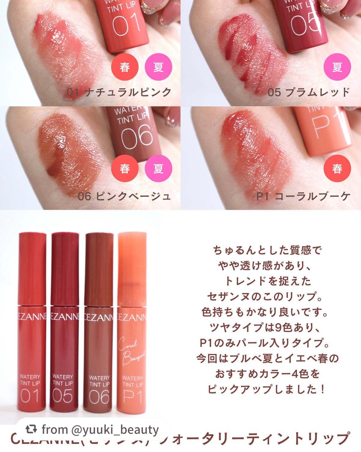 - ツヤ×色×潤いをキープする、セザンヌの新濡れツヤリップ みずみずしい濡れツヤ感ある仕上がりで、発色とツヤが長続きするティントリップです。ティントの発色を透明のベールで覆うリップコートのような処方で、ツヤ感と色をキープします。さらに、唇表面のべたつきは少なく、しっとり潤うオイルinウォーター処方を採用しています。