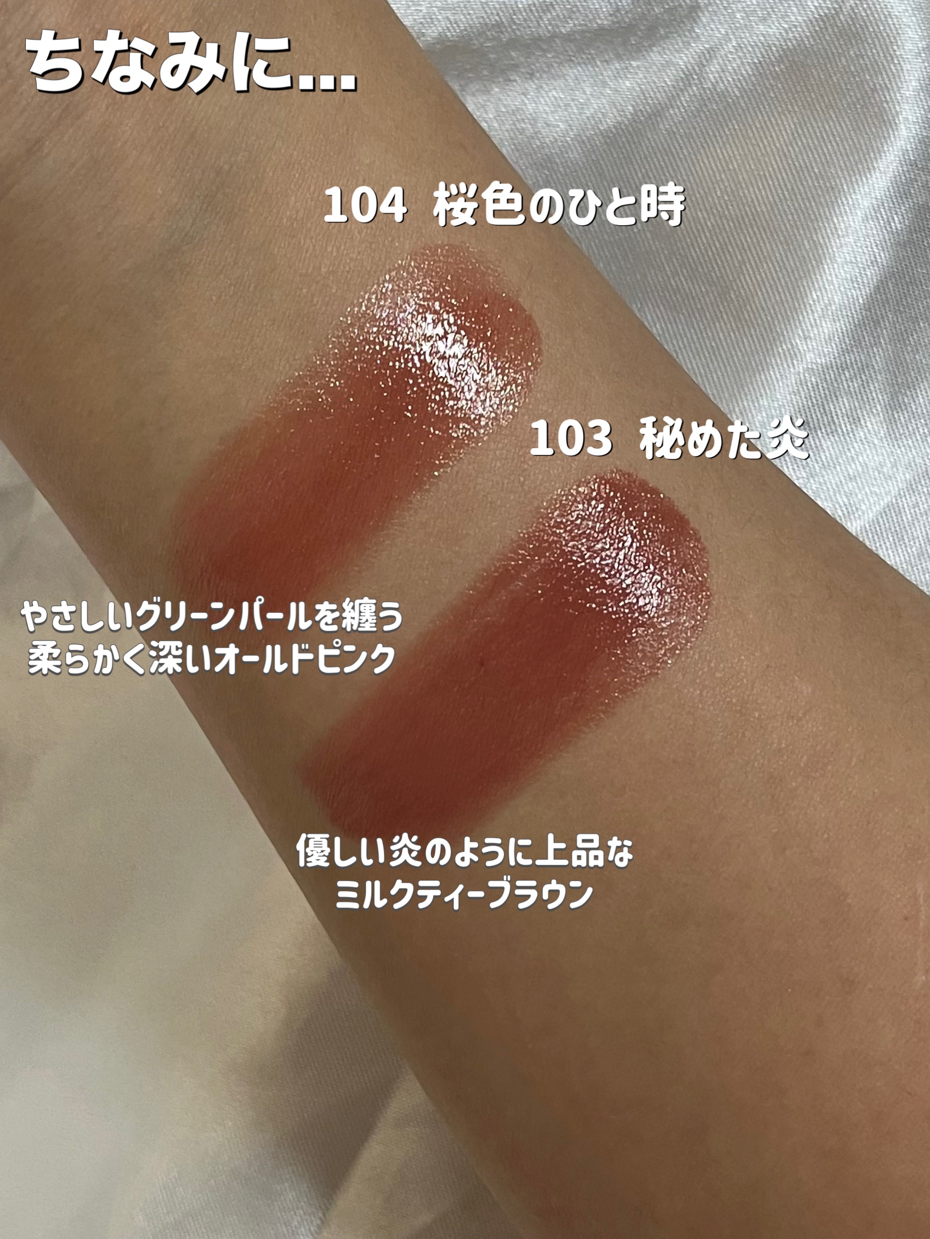 思っていたよりもシアーな発色で使いやすい3色でした! 特に106 夜雲の涙は普段絶対に選ばない使いづらそうなカラーだと思っていたのですが、薄づきでニュアンスチェンジにも使えそうな絶妙発色✨️ 104がグリーンパール、106がブルーパール入りでめちゃくちゃ可愛かったです🥰 104が特に人気のようで売り切れ続出!🥺