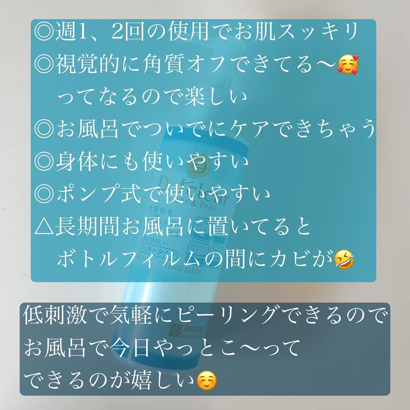 .DETクリアブライト&ピールピーリングジェリー使用レビュー今回使ったのは無香料タイプです。ポンプタイプの容器で使いやすいです。中身はみずみずしいジェルで、優しく肌を撫でるとポロポロと消しゴムのカスのようなものが出てきます。洗い流した後はすべ...