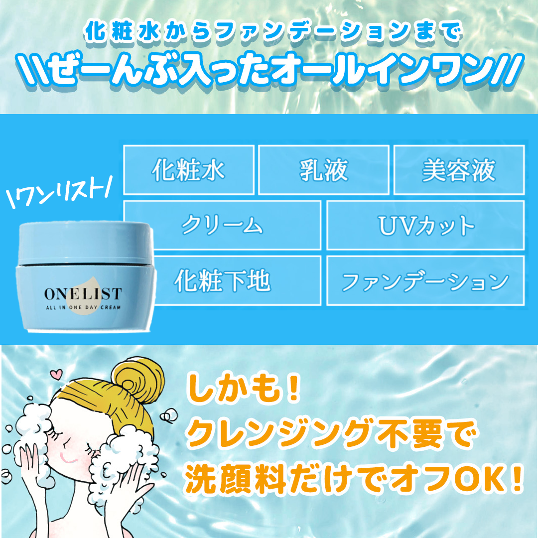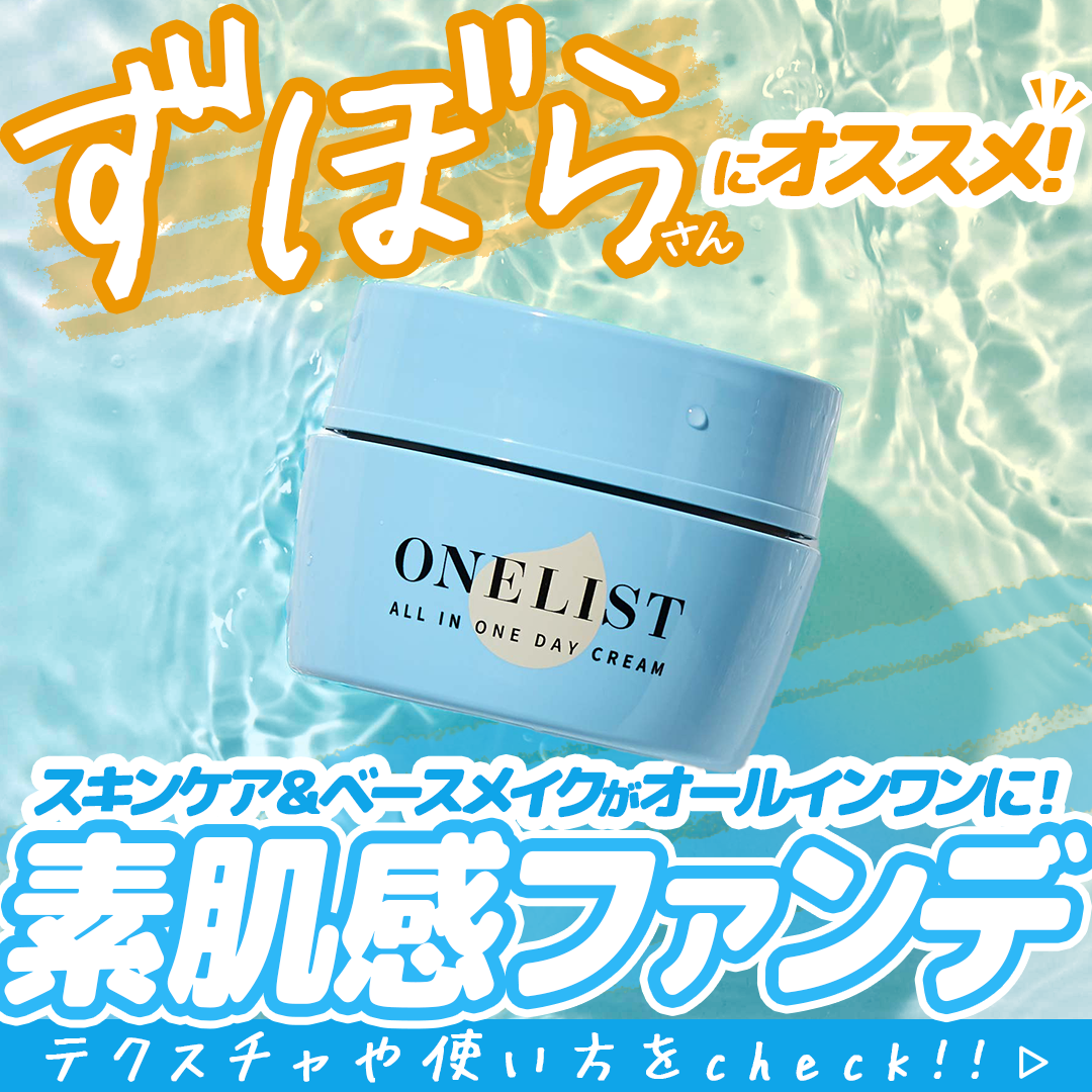 - ※2024年2月9日〜パッケージリニューアル。 忙しい朝は洗顔後にこれだけ!化粧水からベースメイクまでがひとつになった【色つきオールインワンデイクリーム】。 1個で7役【化粧水・美容液・乳液・クリーム・UVカット・化粧下地・ファンデーション】。 カプセル化した美容成分(レチノール、水溶性コラーゲン、加水分解ヒアルロン酸、ビタミンC誘導体、水溶性セラミド)が時間と共に放出され、一日中うるおいを与えます。 ファンデーション成分配合で素肌キレイ見せ。自然なカバー力で崩れてもキレイが続く。 日常紫外線をしっかりカットするSPF30/PA+++。 石けん・洗顔料で落とせます。 無香料・無エチルアルコール・無鉱物オイル・弱酸性・パラベンフリー。 ※2024年3月20日~\ワンリスト ラベンダーベージュ新発売/ ラベンダーベージュのトーンアップ効果を追加した1品7役【化粧水・美容液・乳液・クリーム・UVカット・トーンアップ*化粧下地・ファンデーション】 Amazon限定販売。*メイク効果による
