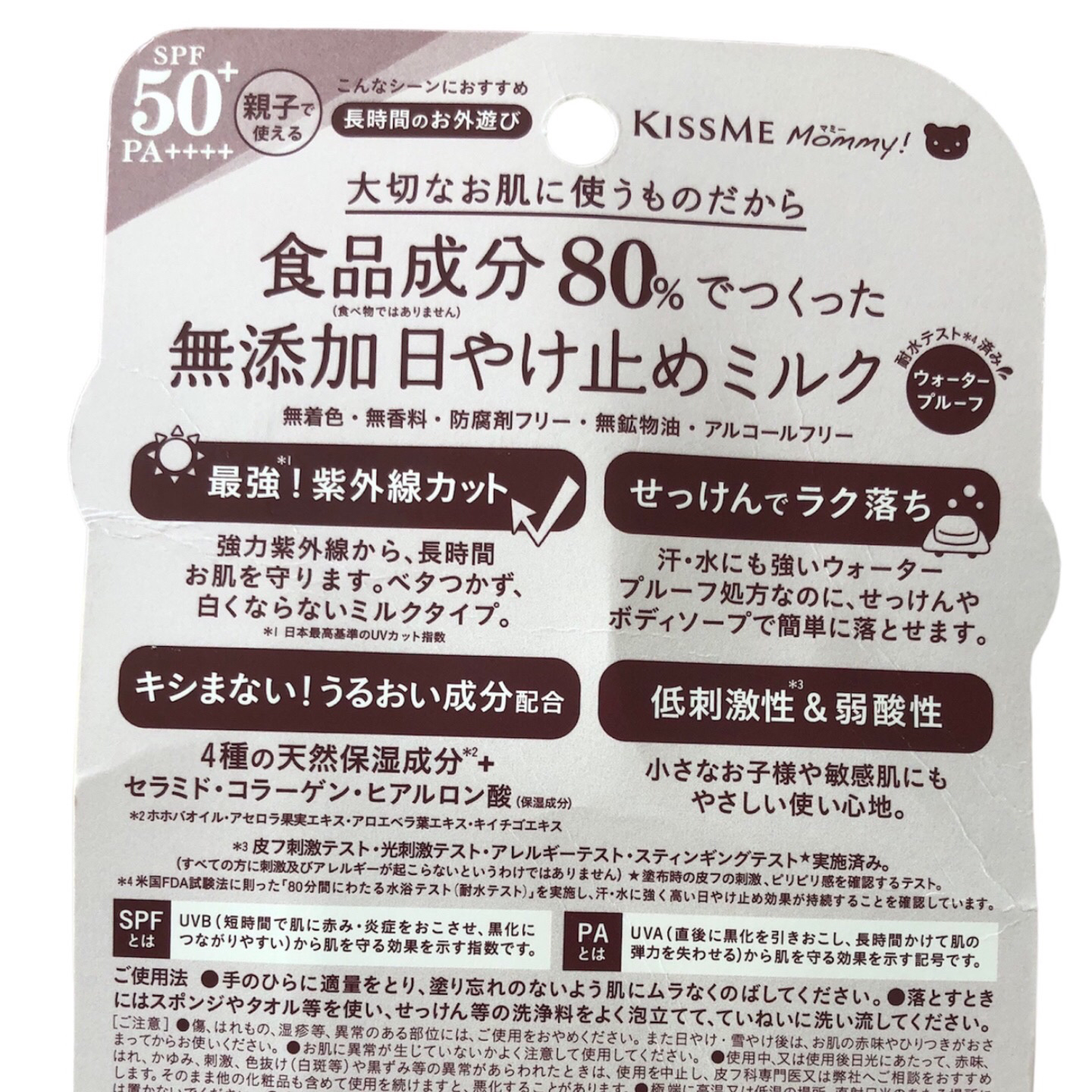 - ■親子でやさしく使える80%食品成分、無添加処方の日やけ止めミルク ◇大切なお肌に使うものだから、80%食品成分 <食品成分とは・・・> 食品や食品に使用される成分の範囲内から当社が厳選した成分です。 ※商品は、食べ物ではないのでご注意ください。 ◇無添加処方 無着色・無香料・防腐剤フリー・無鉱物油・アルコールフリー。 ◇白浮きせず、ベタつかない軽いミルクタイプ 肌へスーッと伸び、サラサラとしたつけ心地でベタつき白浮きなし ■SPF50+ PA++++ 日本最高UVカット指数で、外で遊ぶ時間が長くなるわんぱく世代のお子様にもオススメです。 強力な紫外線から、長時間お肌をしっかり守ります。 ■ウォータープルーフ処方なのにせっけんで簡単に落とせる 汗・水に強いウォータープルーフ処方※1なのに、いつものせっけんで簡単に落とせます。 洗い残しなく、クレンジング剤やゴシゴシ洗いが不要なので、赤ちゃんやお子様の薄くデリケートな肌への負担を 減らします。 ※1 耐水テスト済み。 ■低刺激性・弱酸性でデリケートな肌にもやさしく使える 皮フ刺激テスト・光刺激テスト・アレルギーテスト・スティンギングテスト※2を実施済みです。 赤ちゃん※3から敏感肌の大人の方にも使えます。親子でのご使用もおすすめです※4。 ※2 スティンギングテストは、塗布時の皮フの刺激・ピリピリ感を確認するテストです。 ※3 推奨年齢:1歳~ ※4 小児に使用させる場合には、使用法を守り、必ず保護者の指導監督のもとで使用させてください。 ■4種の天然うるおい成分と保湿成分配合 4種の天然保湿成分、ホホバ種子油、アセロラ果実エキス、アロエベラ葉エキス、キイチゴエキス(保湿成分)と、セラミド、コラーゲン、ヒアルロン酸(保湿成分)を配合。UVケアしながら、キシまないうるおい肌に導きます。