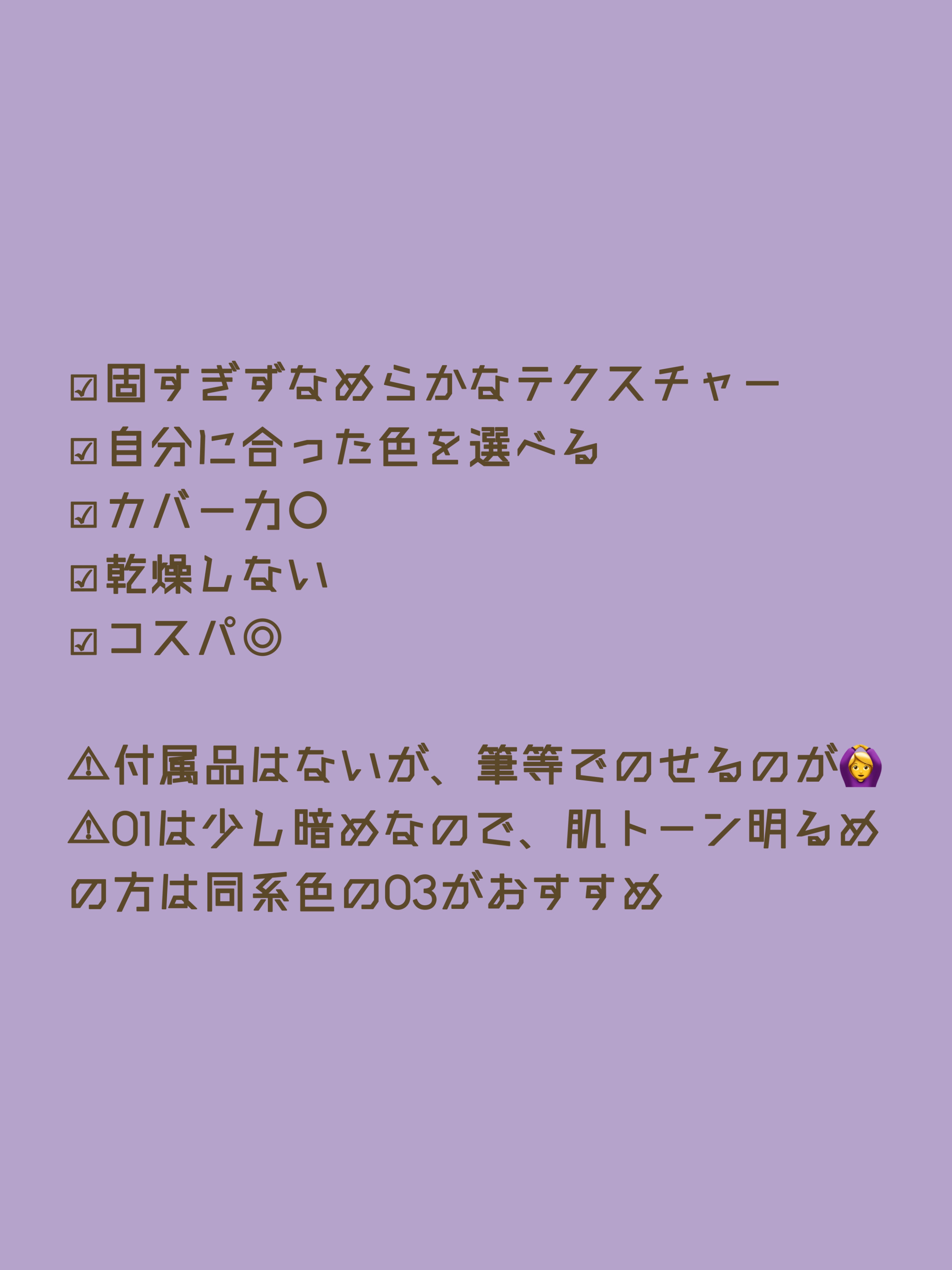固すぎずなめらかなテクスチャー 自分に合った色を選べる カバー力◯ 乾燥しない コスパ◎ ザセムのチップコンシーラーはかなり厚みが出て乾燥したりヨレやすいイメージだったためあまり好みではなかったのですが、こちらは厚塗り感なく適度なカバー力で乾燥も感じなくて買って良かったなぁと思います!捨て色もなく欲しい色が沢山入っていて、まさにこういうコンシーラー求めてた…色ムラが気になる方におすすめです!!