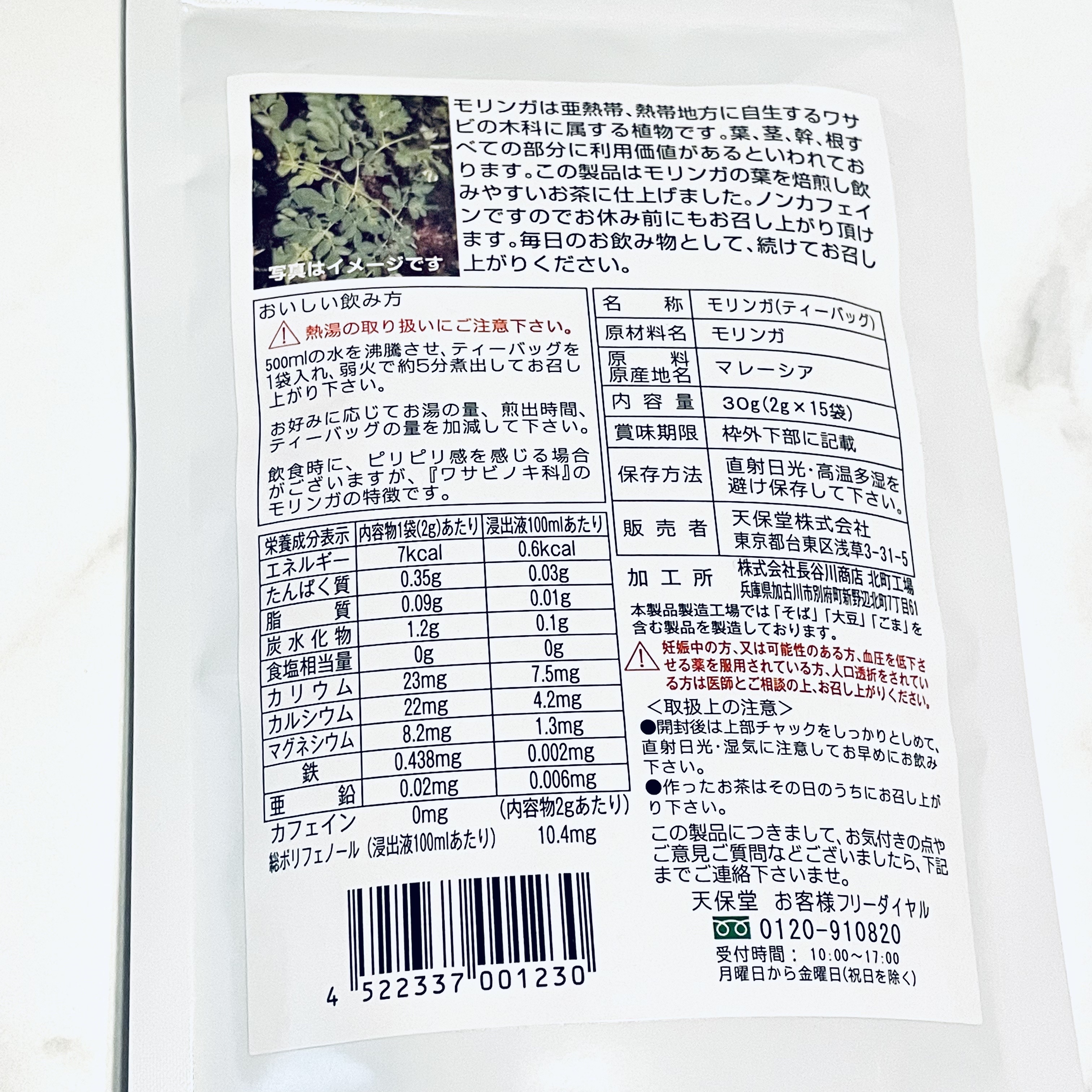 モリンガとは亜熱帯・熱帯地方に自生するワサビノキ科に属する植物で 葉、茎、幹、根全ての部分に利用価値があると言われています✨ モリンガにはカルシウムをはじめ多くの栄養素が含まれており特に毎朝スッキリしない方や疲れやすい方、偏った食生活の方にはオススメです✨ そしてノンカフェインなのでおやすみ前でも安心していただけます✨ 実際にいただいてみましたが思ったよりもあっさりとしていてクセがなかったので飲みやすかったです✨ まれに舌触りがピリピリと感じる方もいると思いますがそれはワサビノキ科であるモリンガの特徴みたいなので飲んでいくうちにだんだんと慣れていくと思います✨