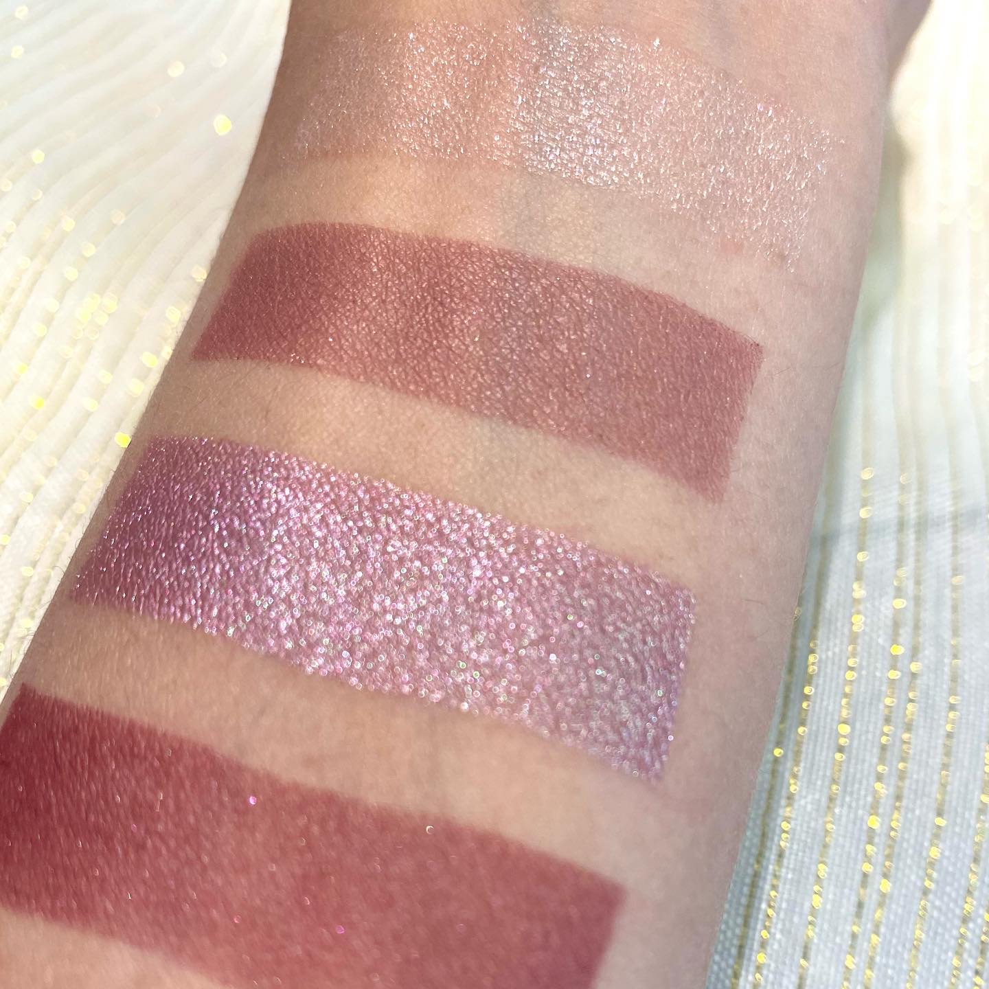 うん、やっぱ可愛い!♡ 神配色👏🏻 今の時期より夏に登場頻度増えそう🙌 ギラギラゴールドがタイプすぎる♡ 左:イエローゴールドシマー ⇒コッパーとゴールドのラメがたっぷり! 大粒ラメがギラギラ夏っぽい 右:シマリングライトピーチ ⇒発色は薄いもののベースや涙袋にだ活躍してくれる ピンクベージュ 左:オレンジ&ゴールデンシマー ⇒ありそうでなかったオレンジカラー オレンジからのゴールドの偏光がたまらない🍊 右:マットパープルレッド ⇒かなり濃いめのパープル!オレンジメイクにアクセントと深みを出してくれる