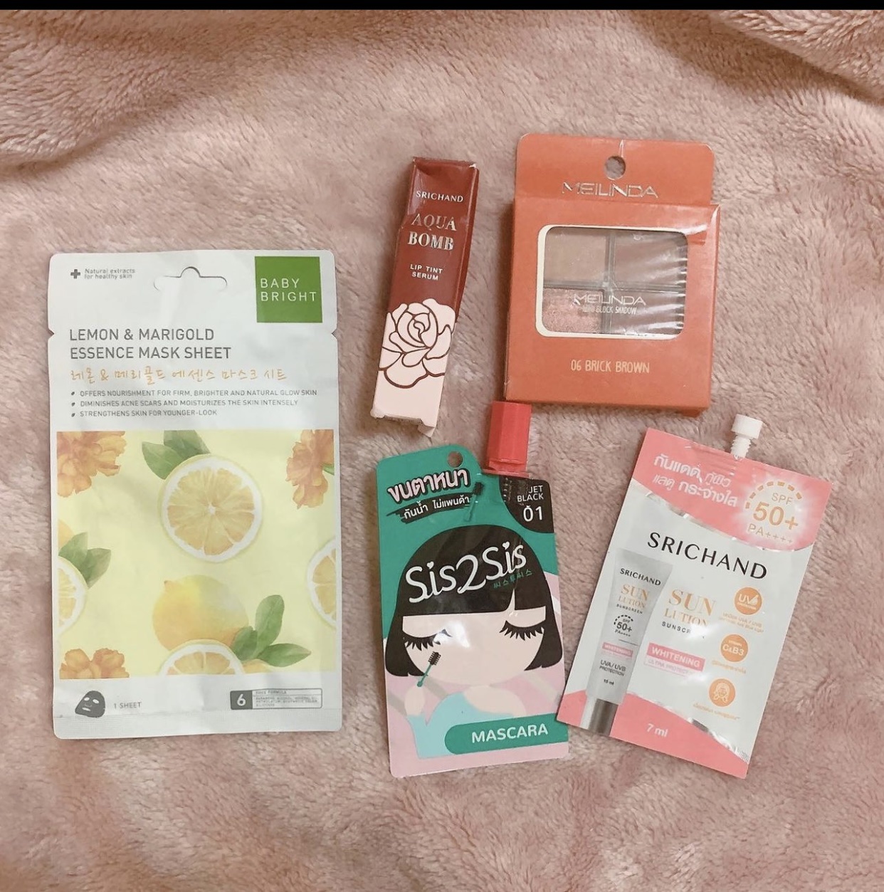 美容大国タイから美容のプロがセレクトしたアイテムがセットになっているよ🫶 私のイエベ春×混合肌にぴったりのアイテムを選んでいただきました🥰 ミールフ🌟タイコスメセット🌟 SIS2SIS mini eyeliner BabyBright レモン&マリーゴールド エッセンスマスクシート SRICHAND AQUABOMB LIP TINT SERUM Meilinda ミニブロックシャドウ サンリューション スキンホワイトニング サンスクリーン SPF50+ PA++++