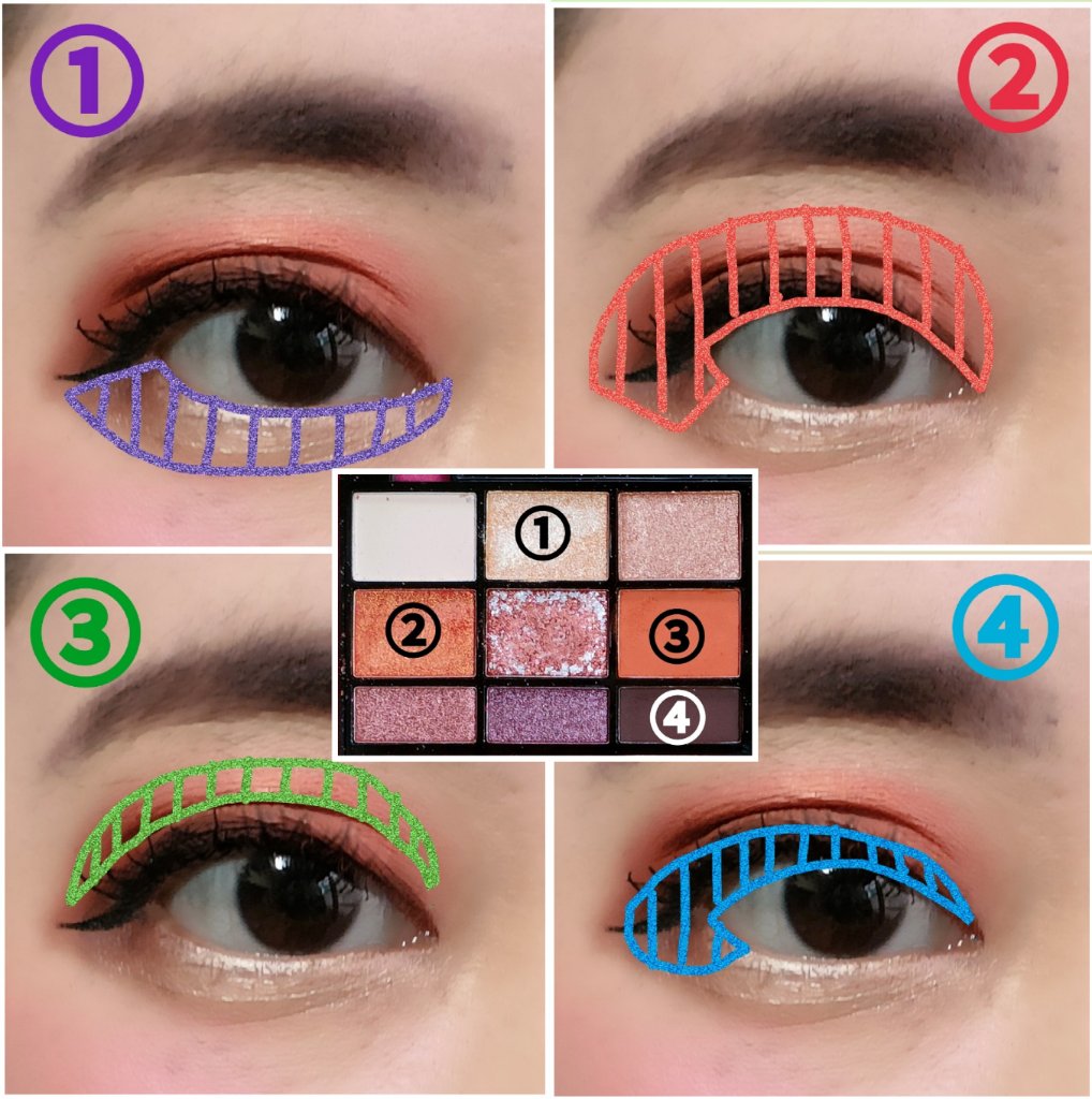 アイシャドウパレットは、URGLAM UR GLAMBLOOMING EYE COLOR PALETTE 02を、使用しました。 マスカラは、MAYBELLINE NEW YORK コロッサルボリュームエクスプレスを、まつ毛全体にまんべんなく塗ります。 リップは、wet 'n' wild MegaLast Lip Colorを、唇全体にまんべんなく塗ります。