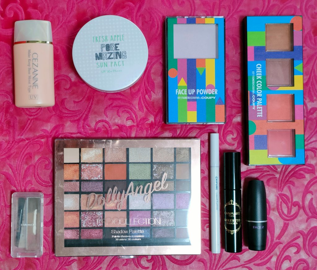 アリィー ニュアンスチェンジUV ジェル RSを、顔全体にまんべんなく塗ります。 RMK RMK ジェルクリーミィファンデーション 103を、顔全体にまんべんなく塗ります。 ジョンソンベビー ジョンソン ベビーパウダーを、顔全体にまんべんなく軽くはたきます。 THE BODY SHOP bronze shade warm glowを、両頬に塗ります。 KATE リフレクトミラーアイズ BR-1の締め色を、眉毛全体にまんべんなく塗ります。 URGLAM UR GLAMBLOOMING EYE COLOR PALETTE 01を、使用しました。 ちふれ リキッド アイライナー 筆ペンタイプ BK30 ブラックを、塗ります。 CEZANNE エアリーカールマスカラを、まつ毛全体にまんべんなく塗ります。 MAYBELLINE NEW YORK コロッサルボリュームエクスプレスを、まつ毛全体にまんべんなく塗ります。 MAYBELLINE NEW YORK SPステイ マットインク 135を、唇全体にまんべんなく塗ります。
