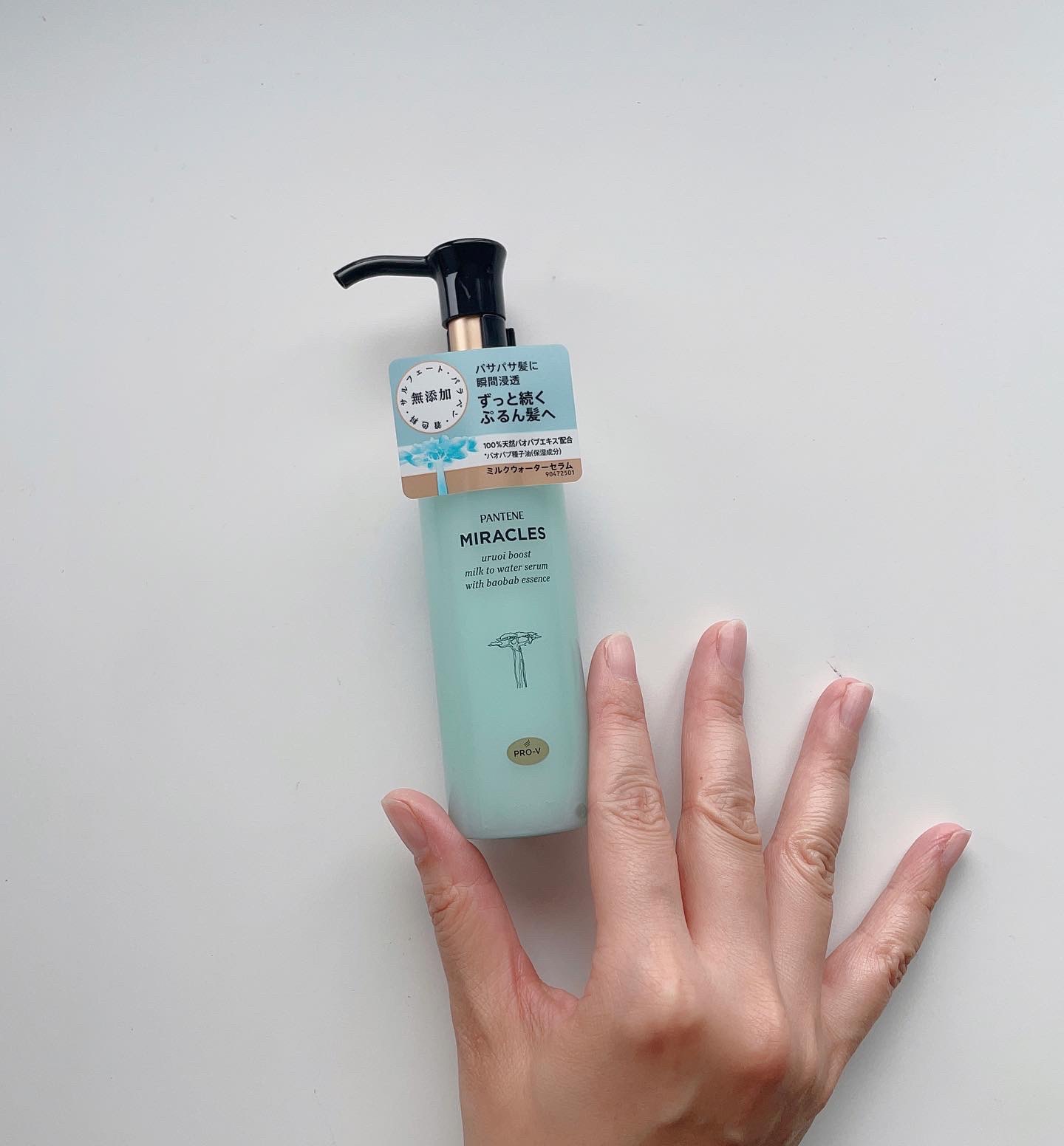 パンテーンミラクルズの新しいヘアケアシリーズで、 ミルクウォーターセラムの厳選保水処方により、髪にうるおいを与えてくれるのだとか。 サルフェート無添加のヘアセラムで、100%天然バオバブエキス*配合しているそう。 ミルクが手のひらで水のようなテクスチャーに変化し、髪の内部に瞬時に溶け込み、毛先までなめらかにしてくれるそう。 そして、ダメージを補修し、シルクのようなぷるん髪を叶え、髪にうるおいを与えながらもべたつかない仕上がりを実現してくれるというので、魅力的に思います。 みずみずしいタイプのミルクは、なじませると更にみずみずしさを感じる、水のような質感に。 スーッと髪になじみ、べたつきを感じません。 「グリーンムスクのみずみずしい香り」は、同ラインのシャンプー&トリートメントと同じ香り。清らかさが感じられて◎ パサつきが気になる自分には、合っているように思います。