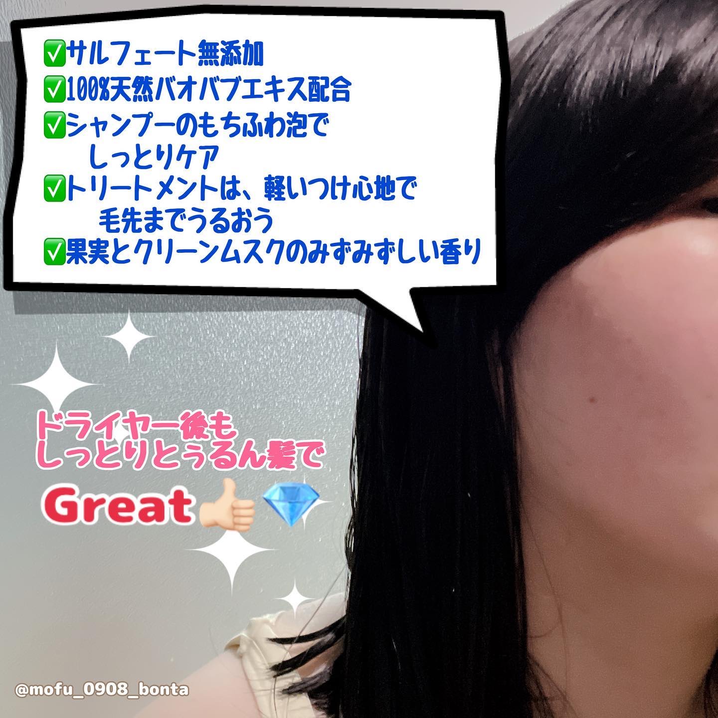 - 100%天然バオバブエキス*配合。 パサパサ髪も毛先まで、みずみずしく満たされた、うるおう髪へ。 こだわりのうるおいケアに必要な成分だけを厳選配合。 もちふわ泡のシャンプーでしっとりケア。 軽いつけ心地のトリートメントで毛先までうるおう。 クリーンムスクのみずみずしい香り。 *バオバブ種子油(保湿成分)