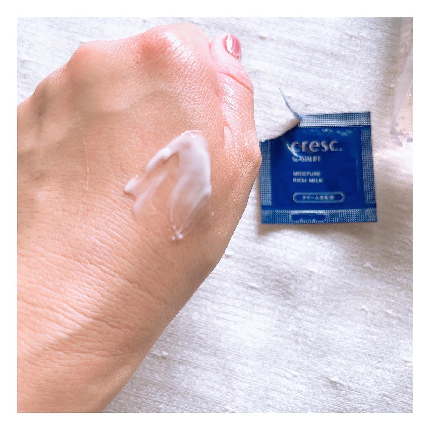 優しいオフホワイトのパッケージが見てるだけで嬉しい気持ちに。 中の化粧液は、ほんのーりトロミがあって柔らかいテクスチャー。 効果的な使い方は、1度顔全体に伸ばしたあと、さらに重ね付けすることなんだそう。