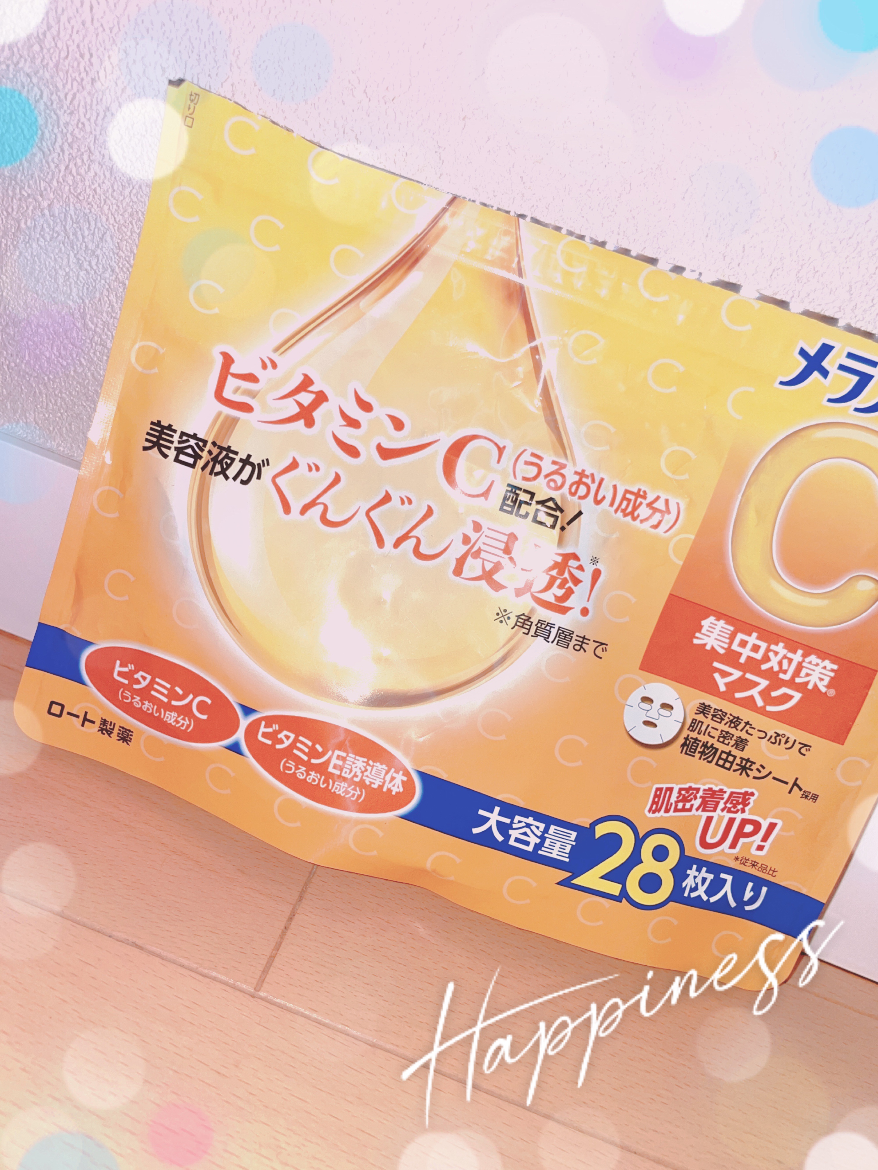 ロート製薬様から頂きました♪メラノCCメラノCC集中対策マスクプラスビタミンC※1※2、ビタミンE誘導体※1※3配合の分厚い密着マスク。※1:うるおい成分※2:アスコルビン酸※3:酢酸トコフェロール厚みのあるしっかりとしたシート!サイズ感はち...