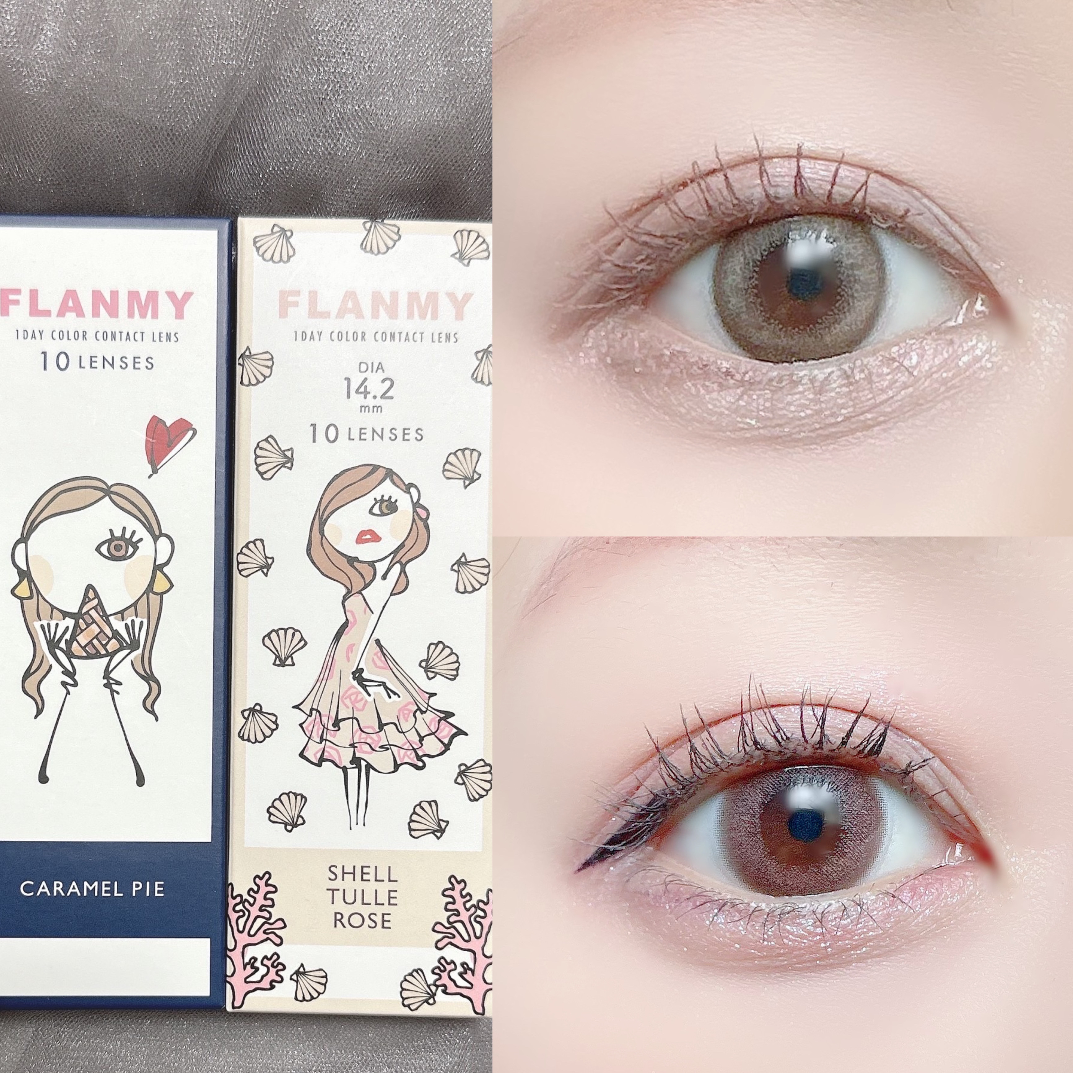 オトナ可愛い瞳を叶える❝ご褒美レンズ❞ 〖FLANMY -フランミー-〗よりパッケージリニューアルを記念して、新色&人気定番色の3種をレビュー🤍 立体感がしっかり出て奥目解消にも◎ CARAMEL PIE -キャラメルパイ- ❮定番色❯ これは人気なわけだ...可愛すぎる...🫣 フチなしでしっかり色素薄めに見せてくれて、儚さたっぷりのあか抜けた瞳に💐 やっぱりグレージュ系カラーは大人っぽく儚げな雰囲気を演出してくれて最高に可愛いですね...