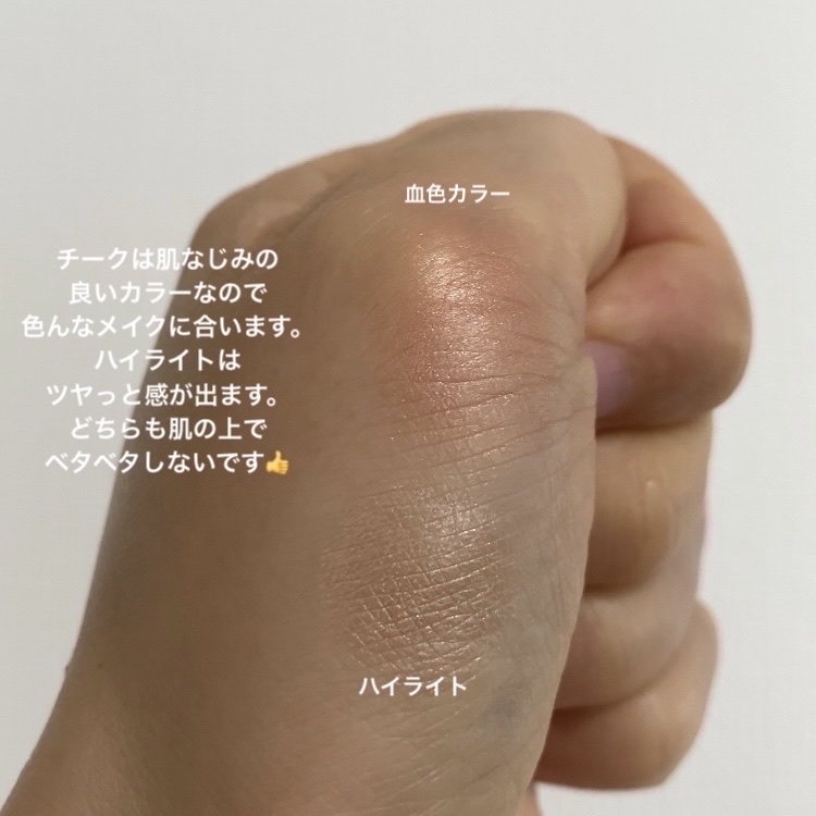クリームチークはポーチに入れることが多くて パウダーに比べて割れる心配が少ないし指で塗れるからブラシが無くても良い所が持ち歩きに向いてるなと思います 密着力が高い所や粉っぽく見えにくいのも好きなポイントです♡ ハイライトはベージュ系の中にピンクのパールも入っていて ほんのり血色感が出るようなカラーです