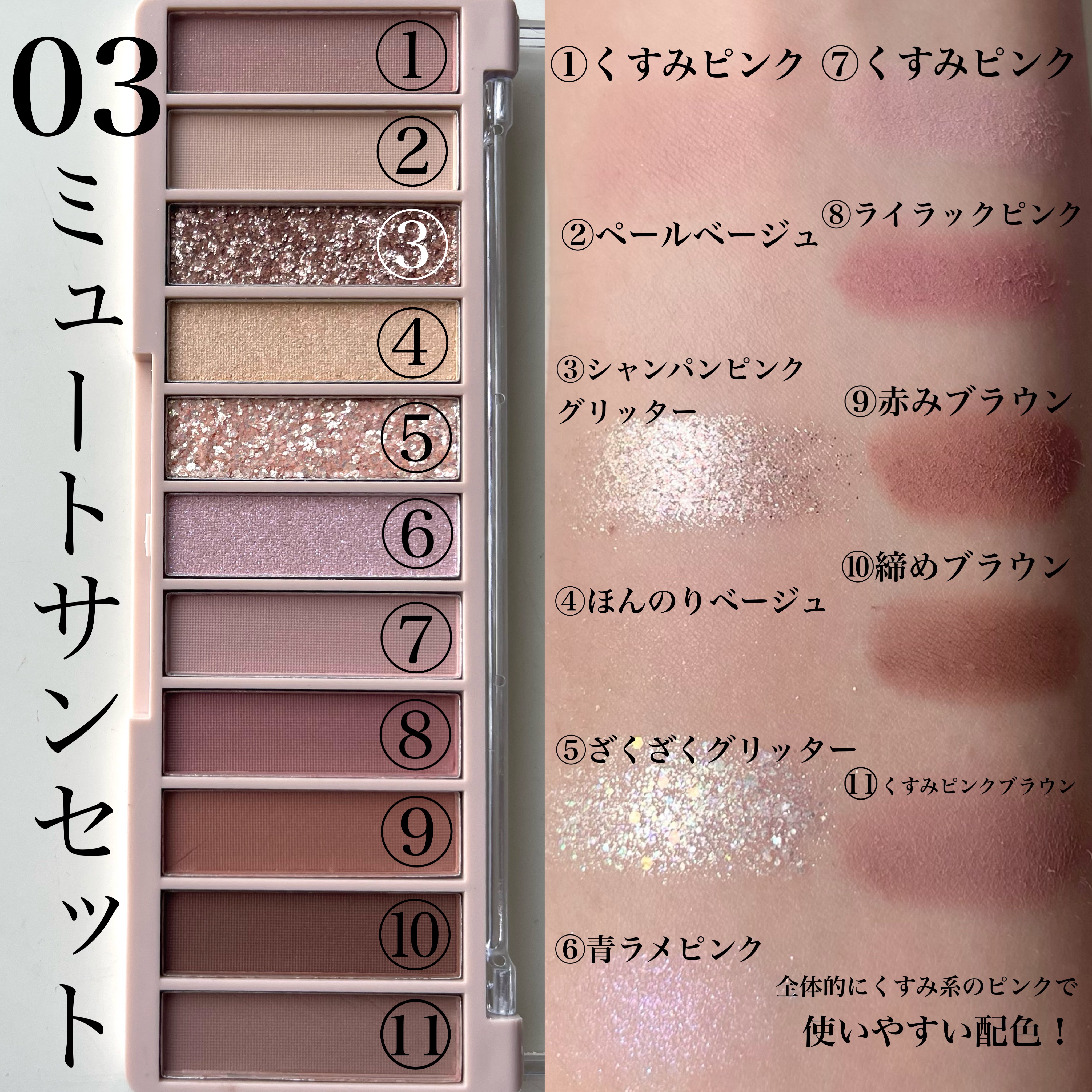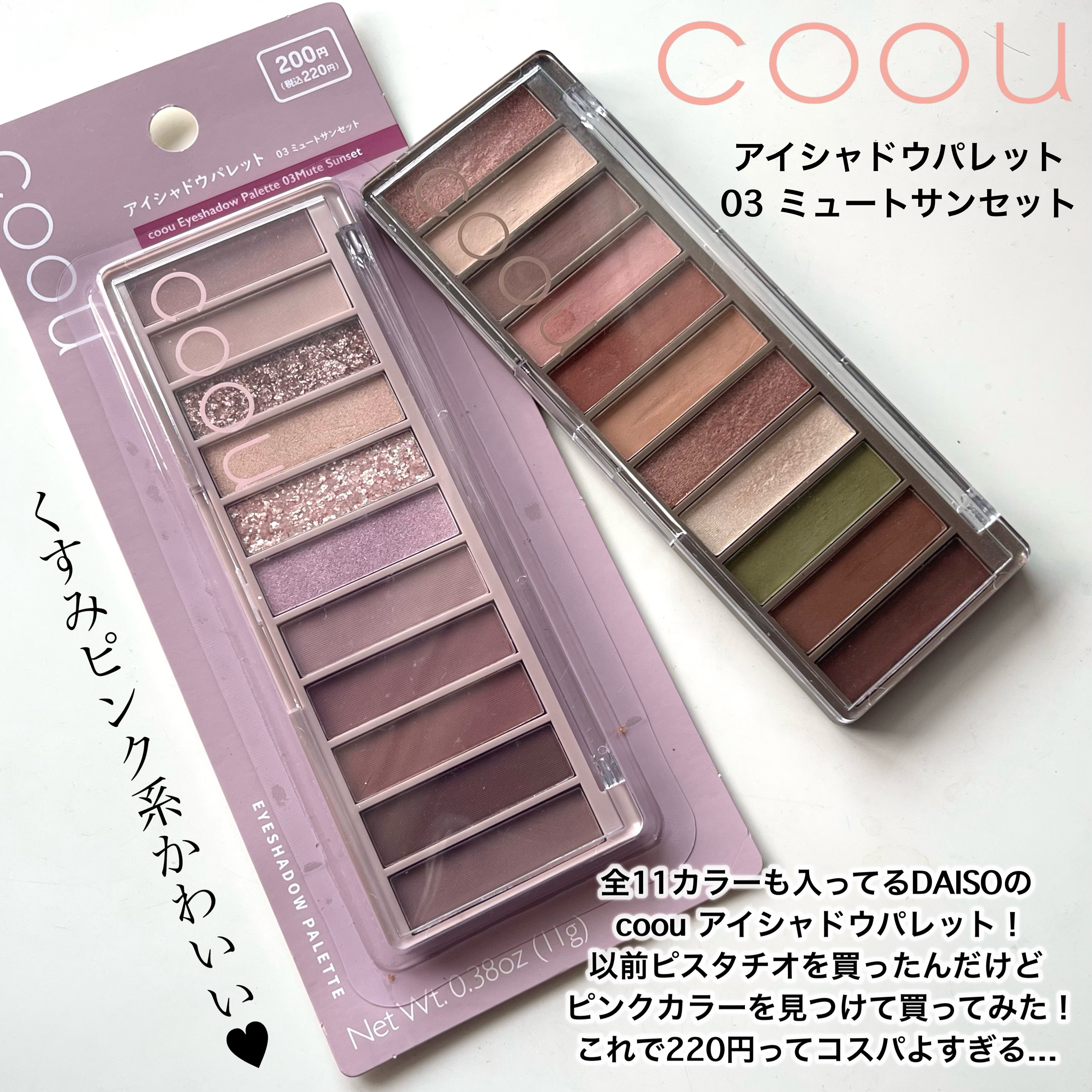 coouアイシャドウパレット02ドライブーケ¥220ラメもあるし、普段あまりつけない色を選んでみました!いつも最初から高いアイテムで普段使わない色にチャレンジしてしまうので試してみて良ければ似た系統を試してみようかなと思います11色もあるので...