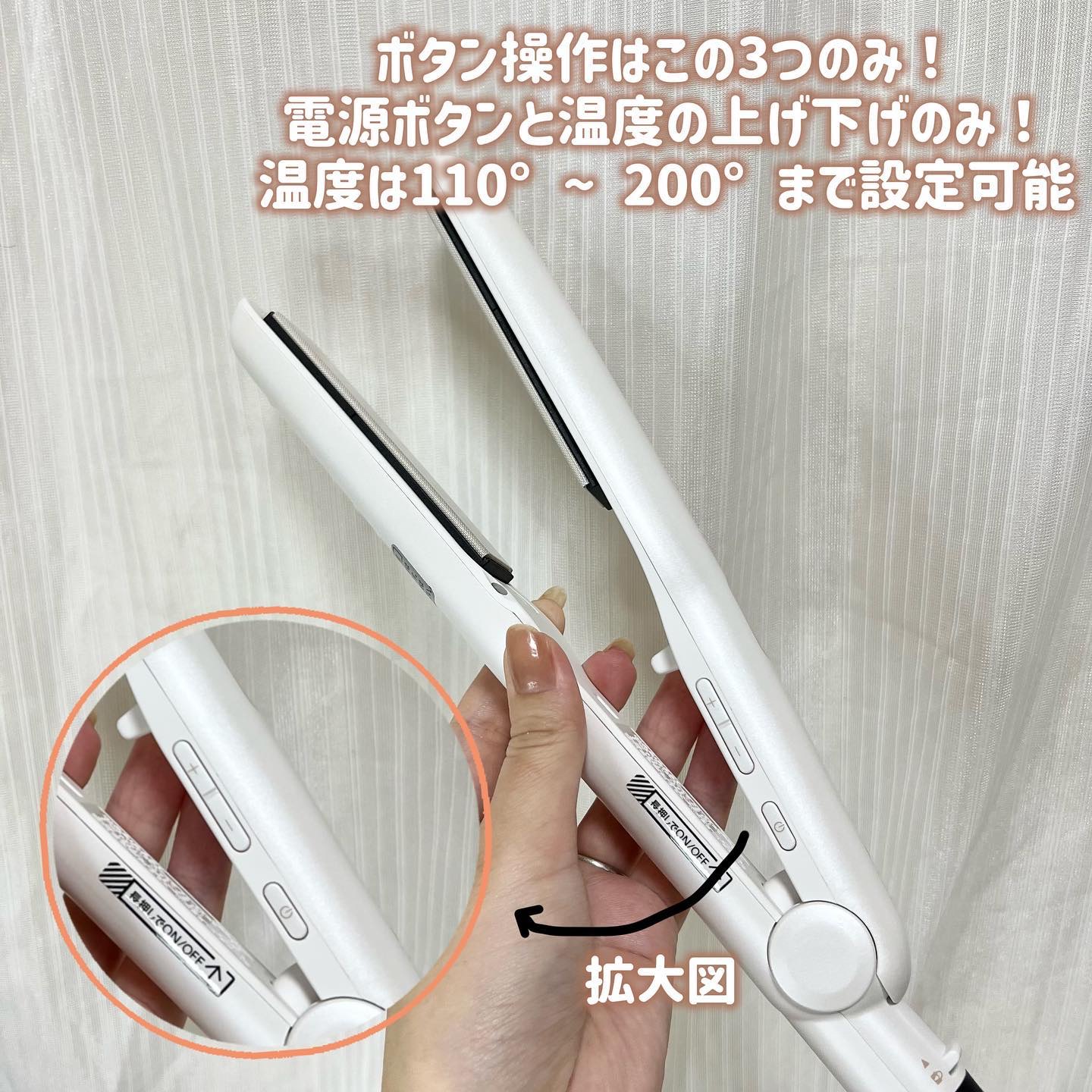 手のひらサイズのヘアアイロン! 持ち運びに便利!前髪やおくれ毛のセットにも! 温度も190°Cぐらいがちょうどいいと思いました!収納時のロック機能もありがたいし 約30分後に自動で電源が切れる安心機能付きだから旅行のときにもぴったり🫶