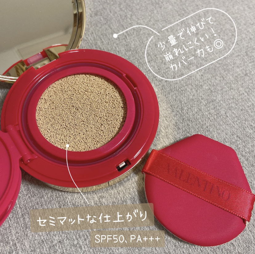 ヴァレンティノGOクッションSPF50+PA+++ パケの高級感とパケの可愛さ♥️持ち歩き決定ですね✨ みずみずしく、のびもいいので使いやすかったです😊カラーは少し明るめでした❗ 他のカラーを試したいです😉 さすがにマスクではよれるので、トナーパッドなどで少しオフして、ポンポンの簡単なお直しにもむいています😃