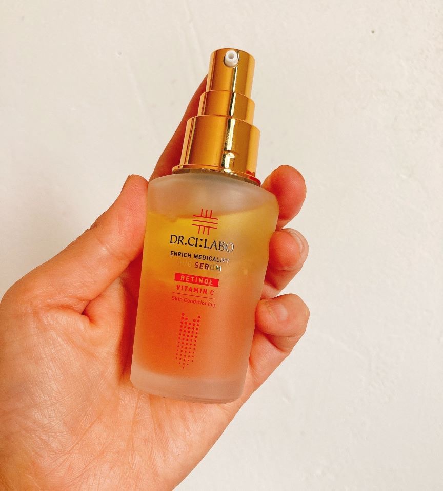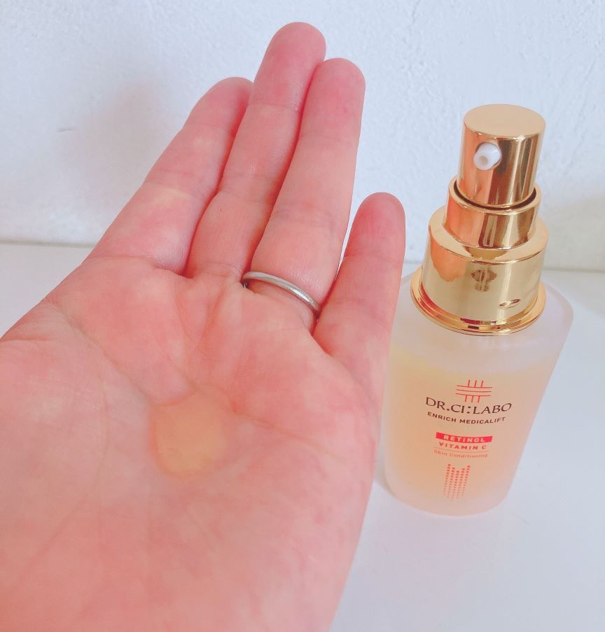 2層式になっていて2秒間シェイクして使う新感覚美容液です🧴 純粋レチノール*1(ハリ・弾力)×高浸透ビタミンC(APPS)*2(うるおい・毛穴・キメ・くすみ) 肌表面がうるおって毛穴が目立ちにくくなるところと、キメが整って肌の内側*3からのハリを実感できるところが大好きです🤍
