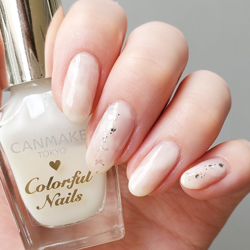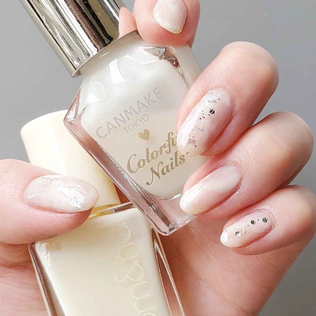 この新色…、激推ししたい1色✨!! ほんのりとピンク感のあるシアーホワイトカラーで、爪のくすみを飛ばして、綺麗に見せてくれる1色♥️ 1度塗りだと自爪の透け感が強いので、2~3度塗りがおすすめ◎ 速乾性があるので、塗り重ねても大丈夫✨ 爪先に、ラメやグリッターをのせると、大人っぽい綺麗めなネイルが短時間で出来ちゃいます♪ 是非ともセブンイレブンにて、チェックしてみて下さいね😳