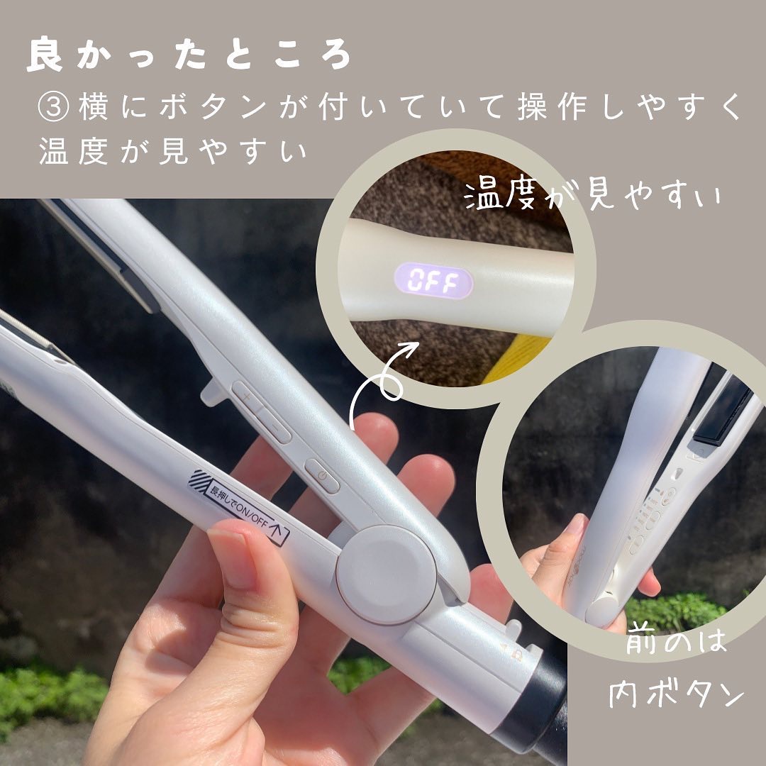 オシャレなデザインになってリニューアル🙌🏻✨ モバイルバッテリーと繋げば、いつでもどこでもスタイリングできちゃう💕 手のひらサイズのコンパクトさでかなり軽い!使用後に収納できるキャップ付きで持ち運びにも便利でかなり有り難い🥹 ピタッと挟めるクッションプレートで軽い力でもしっかり挟めるし、前髪・毛先・顔周りなどのポイントセットやショートの方なら全体にも使いやすいし、メンズのヘアセットにもおすすめ🙆♀️