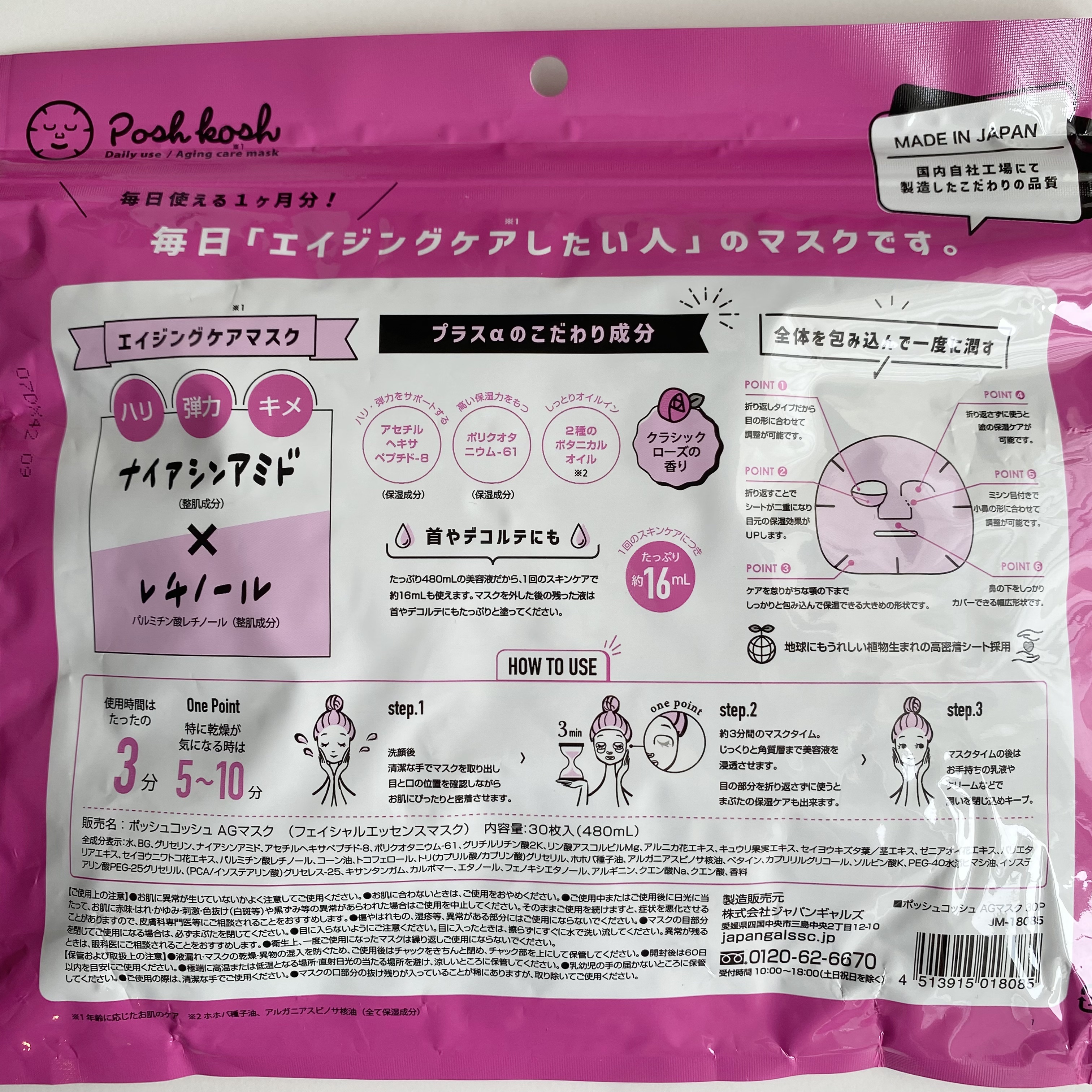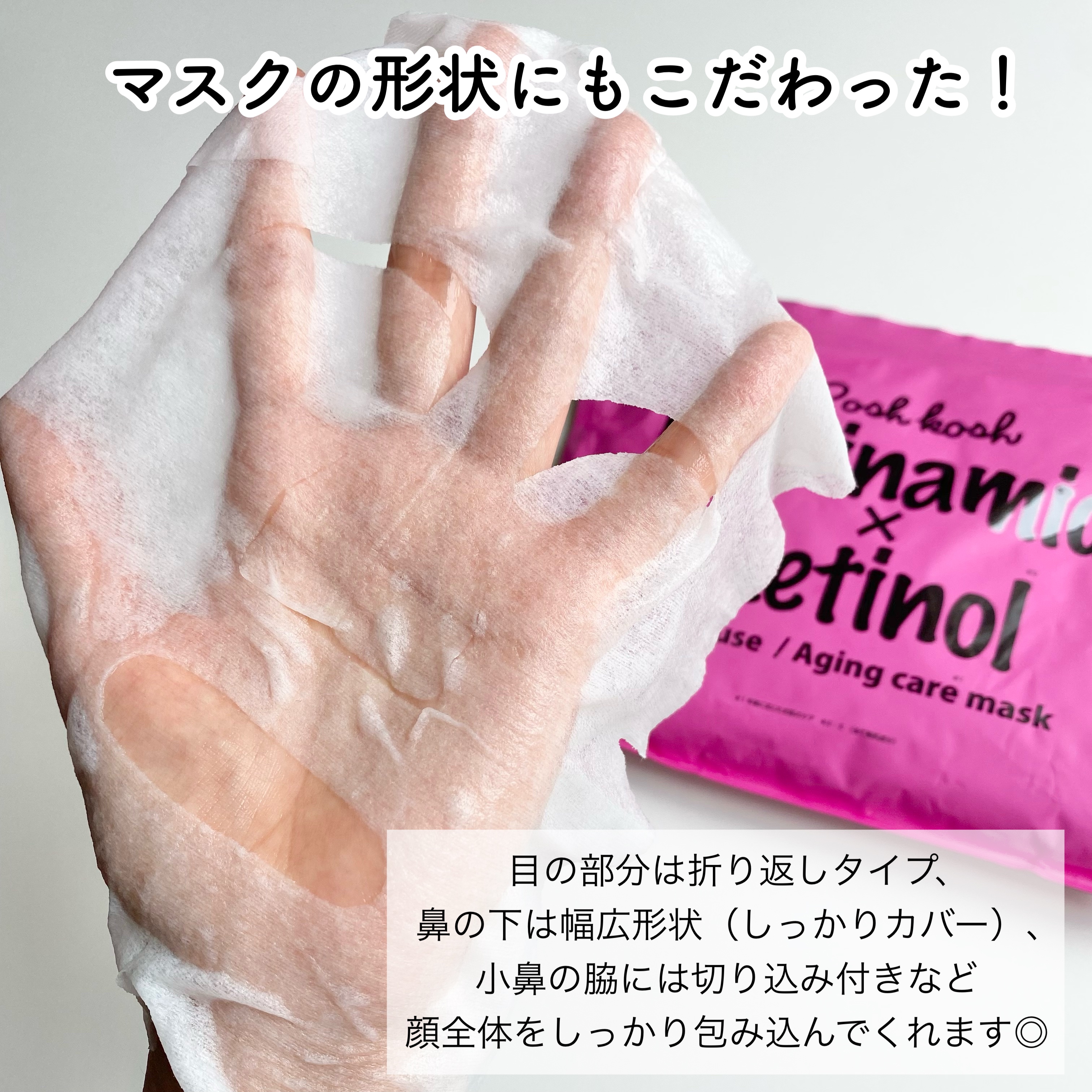 毎日使いやすかったです! 液もかなりヒタヒタで最後まで残っていました。 保湿力もあると思います。 お手頃価格だけど国内自社工場にて製造したこだわりの品質です 保湿力のある液ひたひたのパックが30枚。 今回ははエイジングケアのピンクを使用しました。人気の成分、ナイアシンアミドとレチノール配合。エイジンングケア、たるみやくすみが気になる方におすすめです。 たっぷり液量でしっかり保湿出来ました。お肌もツヤツヤになりました。 デイリー使いにピッタリです。