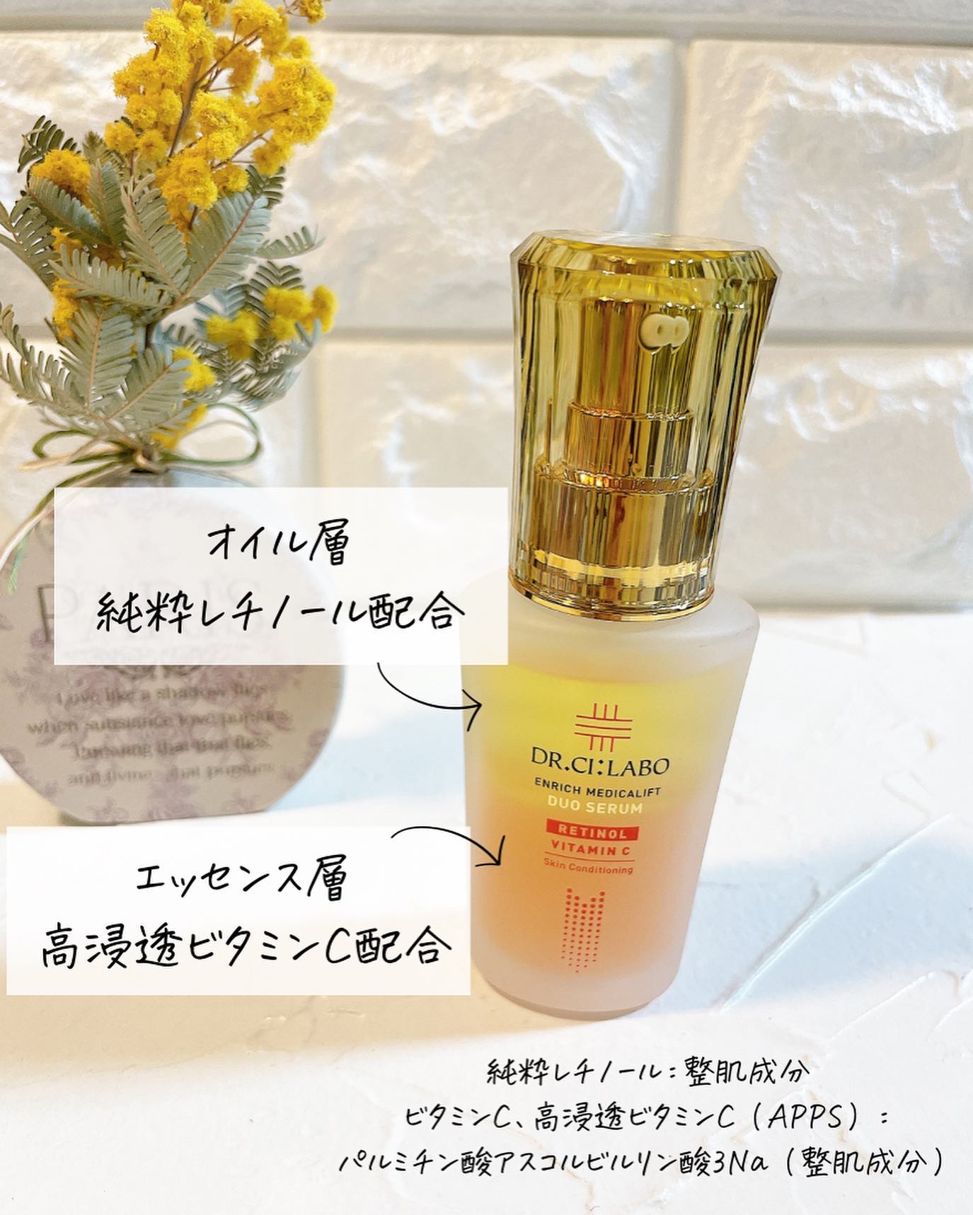 純粋レチノール*1×ビタミンC*2配合✨ \黄色とオレンジ色のセラム/オイル層とエッセンス層を、使う直前に2秒間シェイク🫨 肌の角層からハリ・弾力のある肌に導き、肌表面の「うるおい・毛穴*3・キメ・くすみ*3」へアプローチ🙆♀️