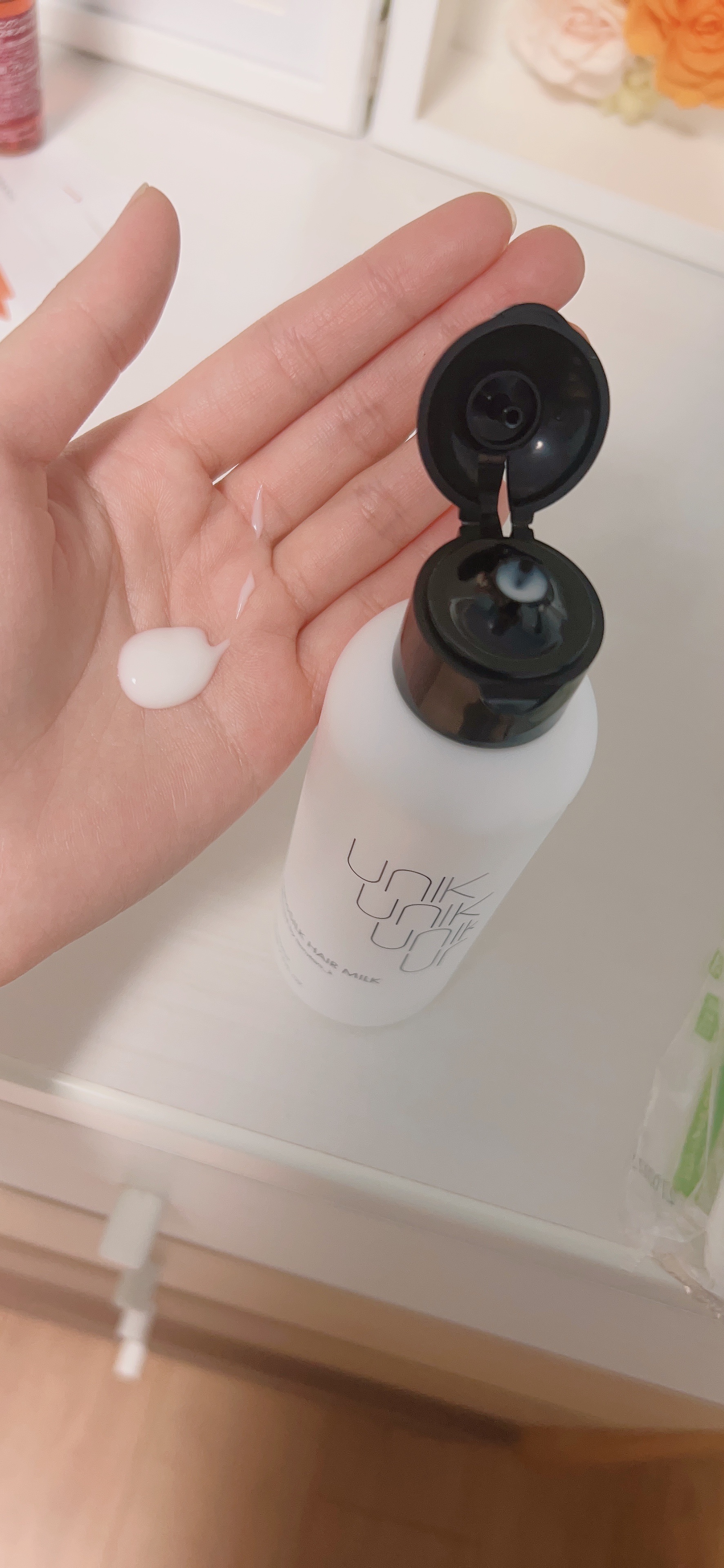 業界初「シルクナノファイバー」配合。 シルクは人の肌のアミノ酸と構成が近く、人体親和性が高い成分。 保湿作用・感触の改良・抗菌性・UVカット効果などの機能があるらしい。 シルクナノファイバーは、髪の細部に入り込み、シルクそのものの滑らかな肌触りや光沢感を与えるそう。 さらに、髪に必要な栄養分が贅沢に配合され、広がりやパサつきを抑え、潤いのある髪へ導くとのこと。 使うのは、お風呂上りなどの濡れた髪に。 とろんと柔らかなミルクで、髪にすんなりとなじむ。 香りがとても良い💛 爽やかさとフローラルな甘さを感じる柑橘とベルガモットの香りで、夏に心地よく使える。 仕上がりは、サラツヤ✨ 重さを感じないのに、するんとまとまりが良くなる。 指通りも良くて、スタイリングの時もストレスを感じない。 ナノシルクで、憧れのシルクヘアが叶うといいな☺