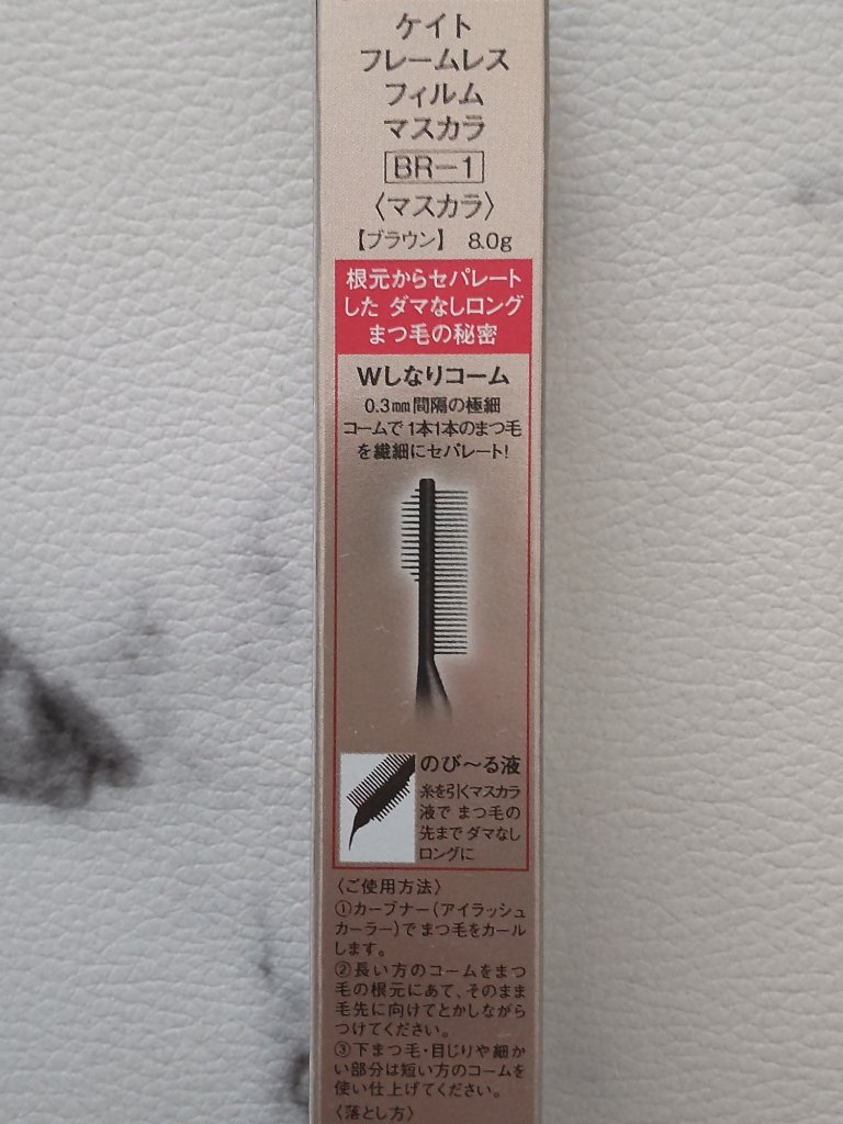 KATEのフレームレスフィルムマスカラはまたの名を美嘘マスカラ!美しい嘘、ってなんだか素敵な名前…!あまり盛った感なく、自睫毛が伸びたような自然な仕上がり。私のカラーはBR-1ブラウンなんですが、明るめのクリーミーな茶色です。瞳が明るく見える...