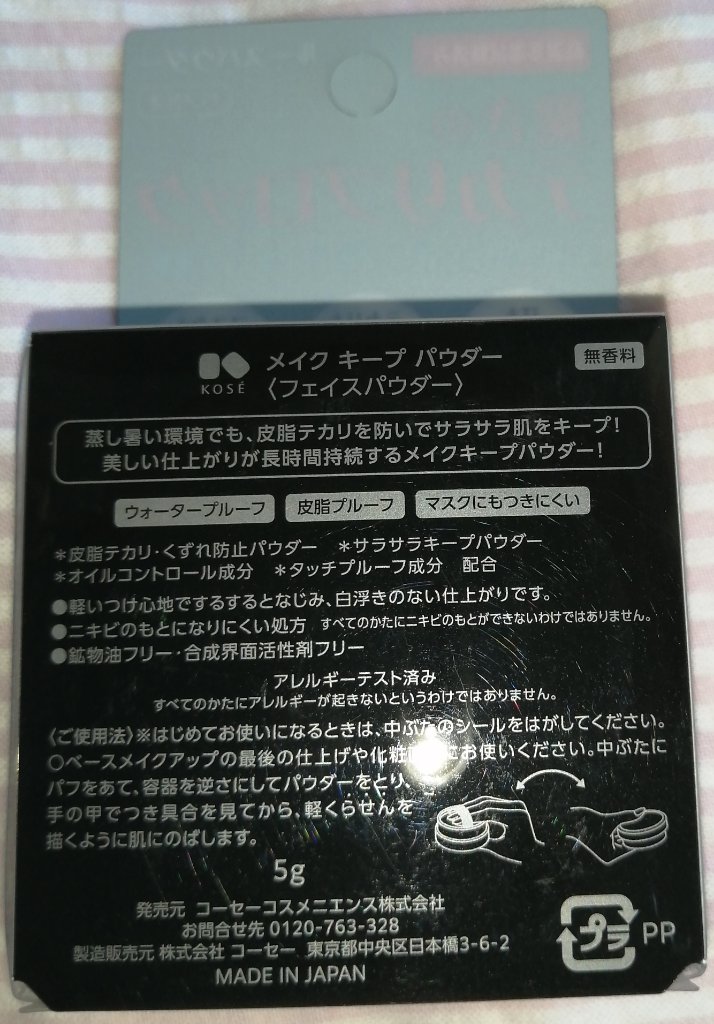 蒸し暑い環境でも、皮脂テカリを防いでサラサラ肌をキープしてくれるそうです。美しい仕上がりが長時間持続するメイク キープ パウダーです。 粒子の細かい片栗粉系のパウダーで肌なじみが良く、サラサラの仕上がりです。 このパウダーとメークキープミストでメイク崩れが軽減されるので、暑い季節には欠かせなくなる気がします。