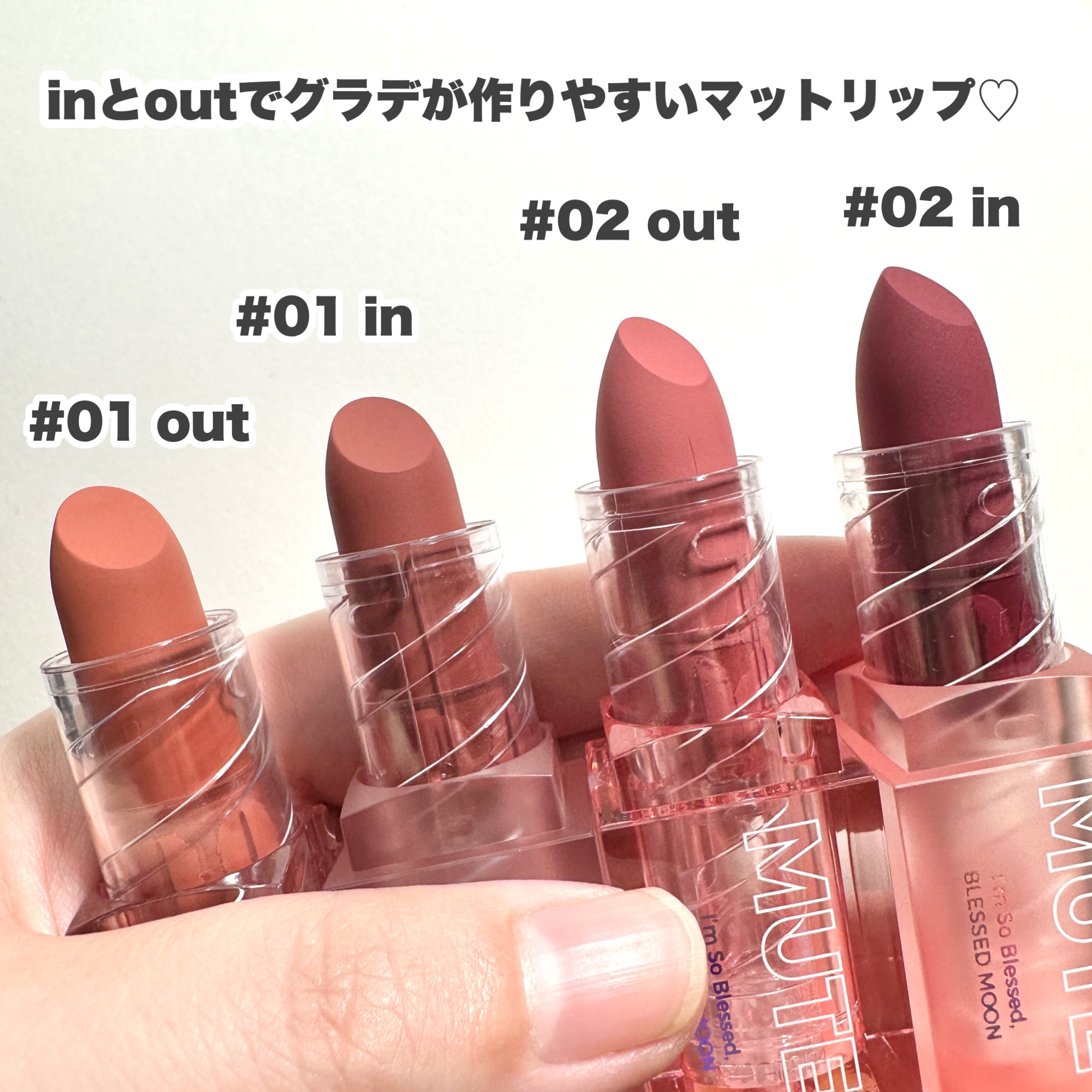 小さめのリップが欲しくて使ってみたBLESSEDMOON(ブレスドムーン)のリップ。今回購入した「アイムミュートリップスティック」はふんわり高発色、1本で印象チェンジできる2way仕様。カラーにINとOUTがあって、1色で塗ってもかわいいけど...