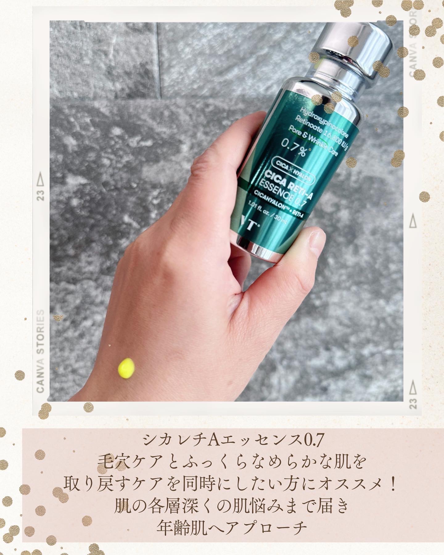 VTCICAレチAエッセンス0.5で、毛穴レスなキメ肌を目指す✨私はレチノールリピ使いなので「中レベル」の0.5%です。私の使用感・効果テクスチャー:みずみずしくて、肌になじませるとべたつきがなくさっぱりとした使い心地がお気に入り。肌の変化:...