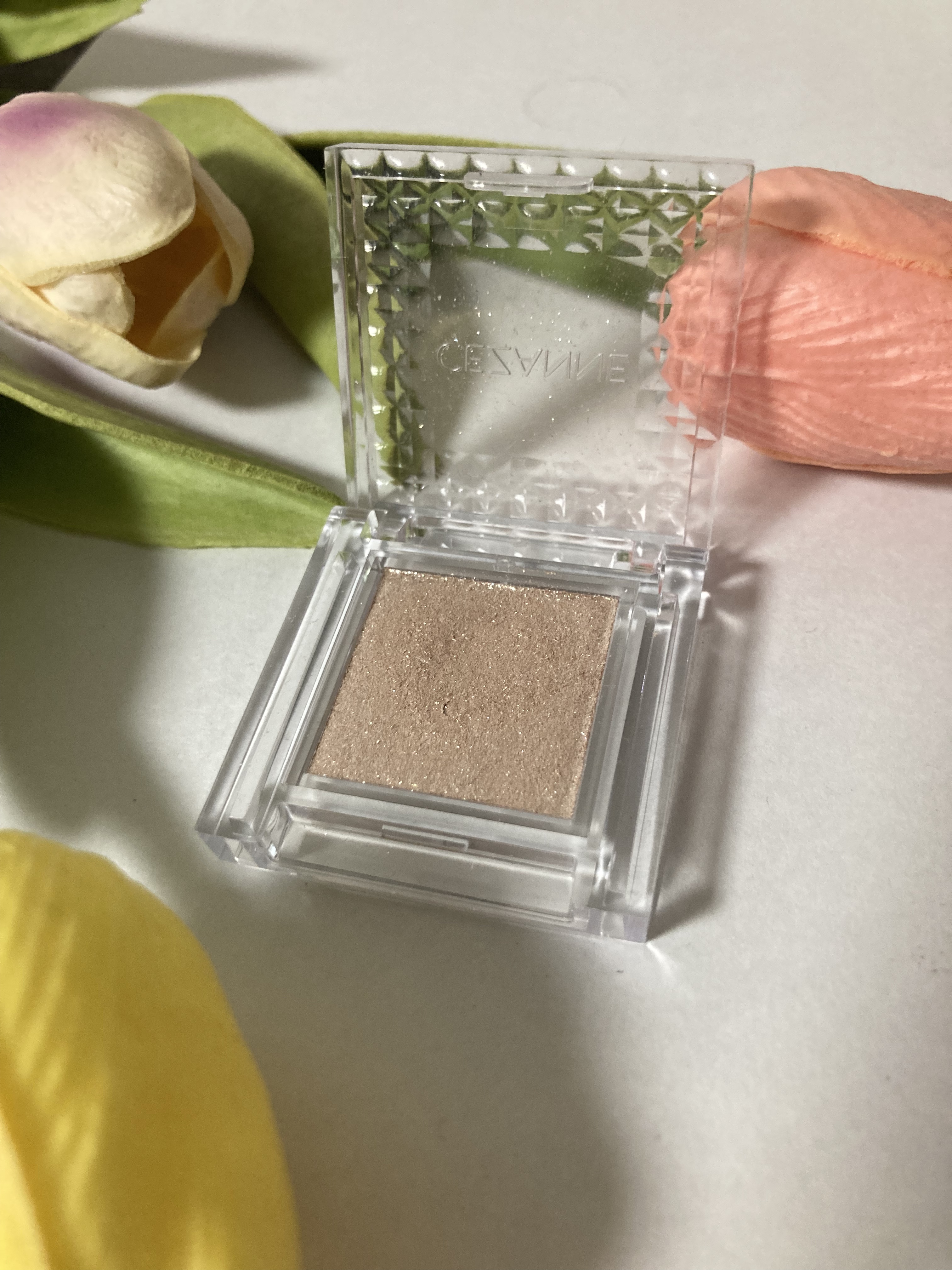 【密着感】♡高ツヤ密着成分により輝きをさらに高めるクリアな薄膜を形成♡パウダー×ゲルのハイブリットによる生質感でまぶたに吸い付くように密着♡スムーズな肌あたりでくまなく伸び広がり均一な輝きへ 【発色】控えめなグレーだが角度によりレッドにもゴールドにも見える 【良いところ】室内では控えめなラメに見えるが太陽光下だと輝きが増し煌めく