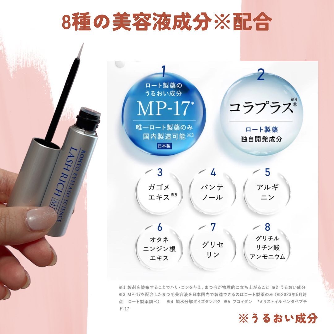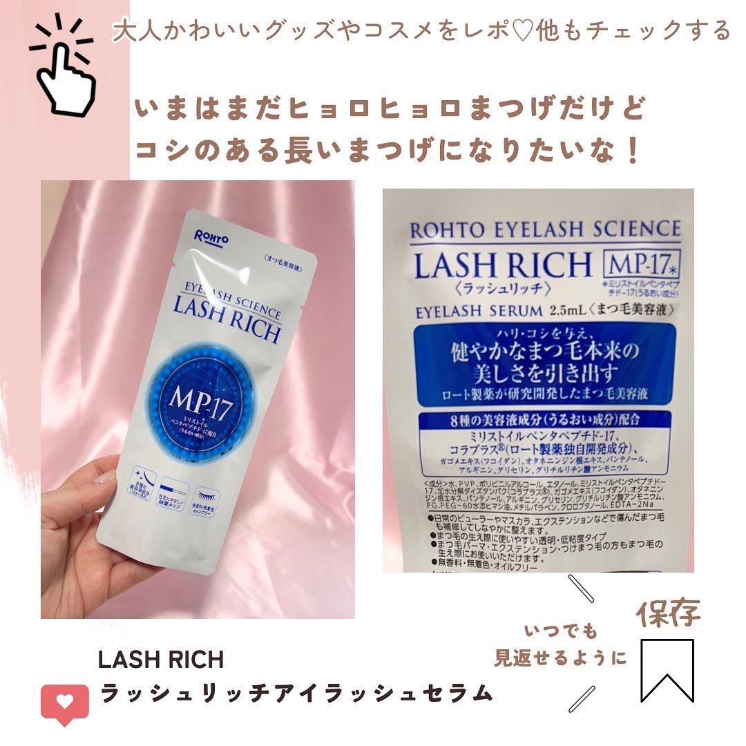 ロート製薬、独自成分配合のまつ毛美容液‼️独自成分プラス6種の美容液成分*も配合💖*うるおい成分☑️ラッシュリッチアイラッシュセラム2.5ml1日に朝・晩2回塗ってまつ毛にハリとコシケア✨1ヶ月で1本使い切りが使用目安極細筆だからまつ毛の際に...