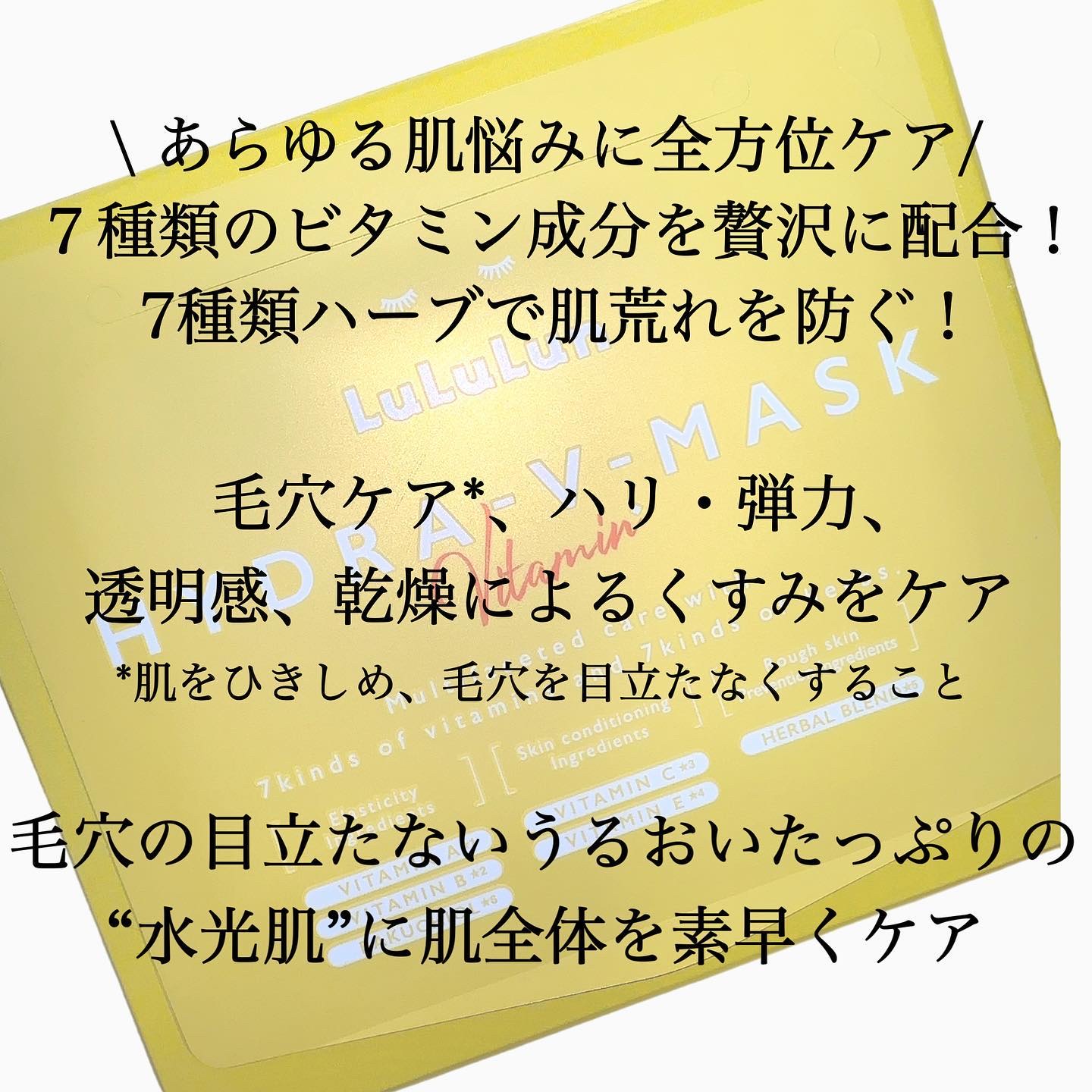 - ルルルンからビタミンたっぷりの化粧水フェイスマスクが新登場。 7種類のビタミン※1と7種類のハーブ※1で肌全体を素早くケア&集中肌メンテナンス。 新開発のフェイスラインに密着するシートで肌を引き締めながら肌のすみずみ※2までうるおいで満たし、毛穴の目立たないうるおいたっぷりの“水光肌”へ。 (※1 全て保湿成分として ※2 角質層まで)